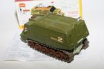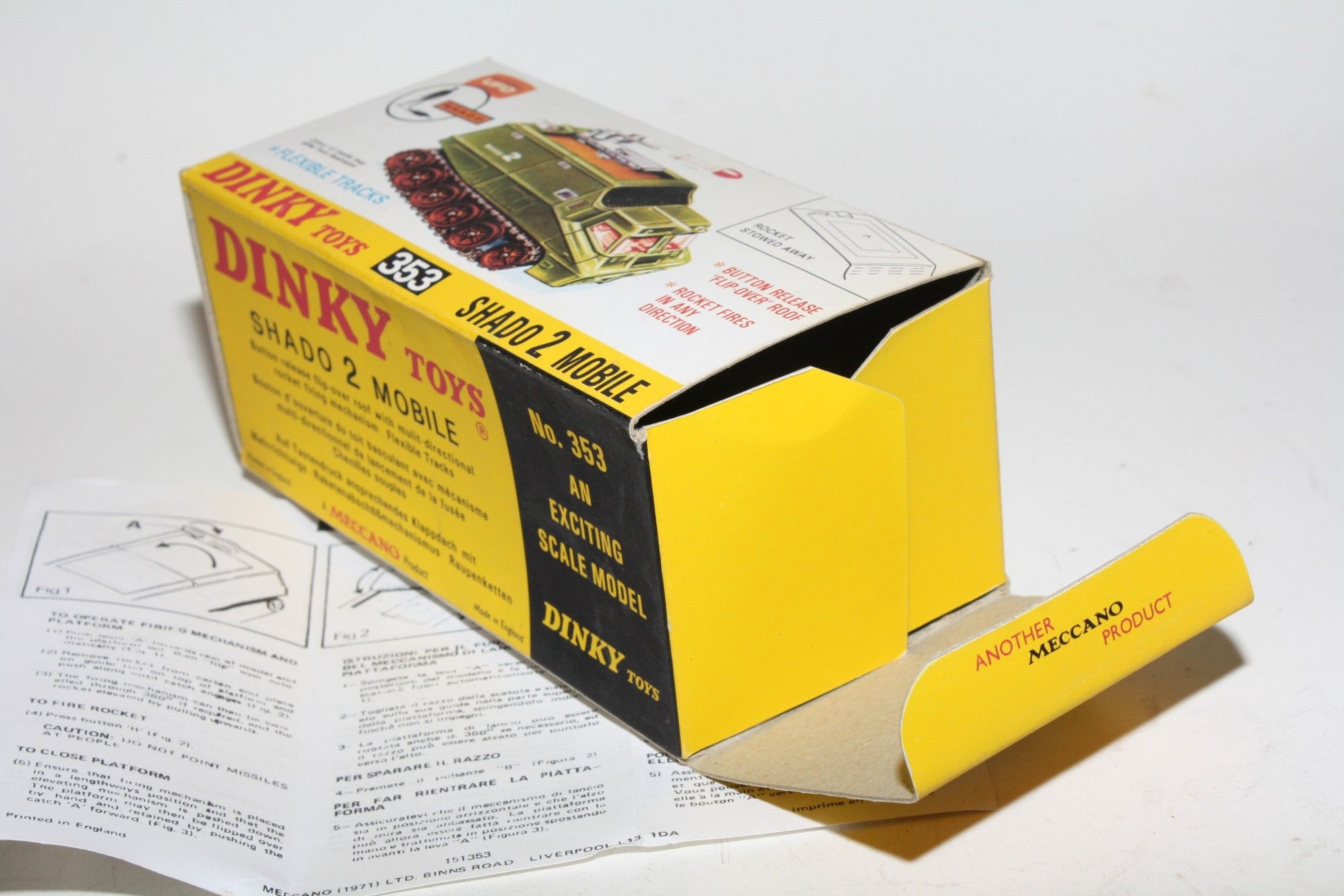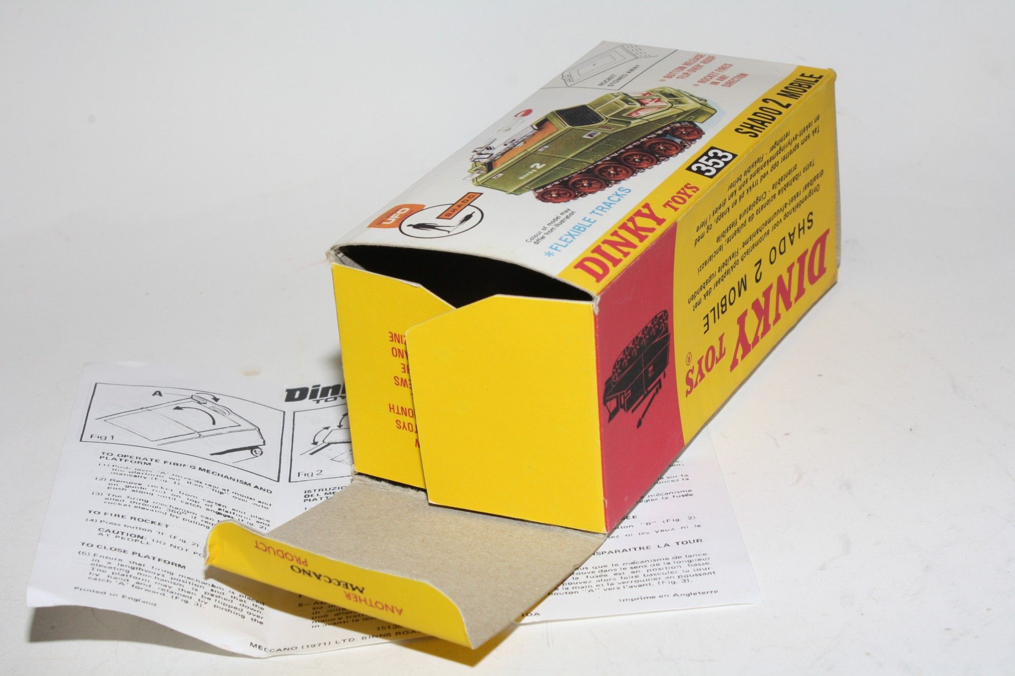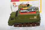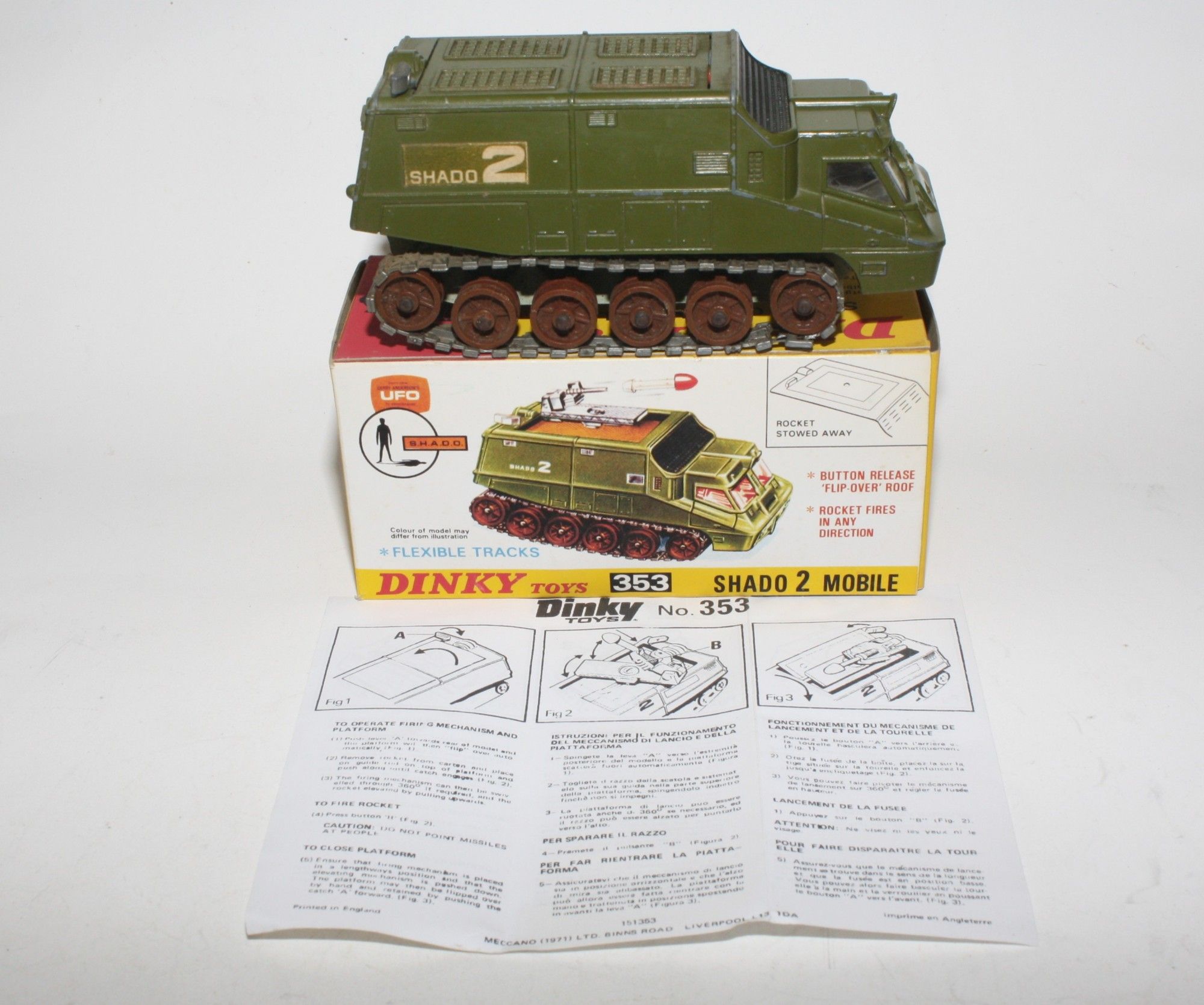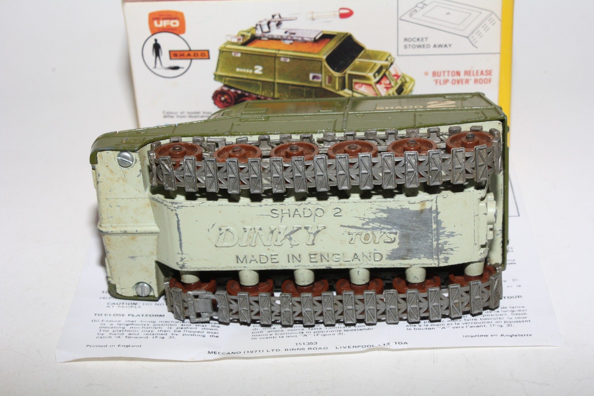 A good example of this UFO Shado 2 Gerry Anderson model. Original green paintwork is good with a few small nicks/rubs/wear, please study the photos. Perfect original silver tracks on brown rollers, windows crystal clear, white interior, missile launcher all in good working order with 1 x original missile, rotating roof all good and locks into position as it should. Pale green baseplate with scratches and playwear.