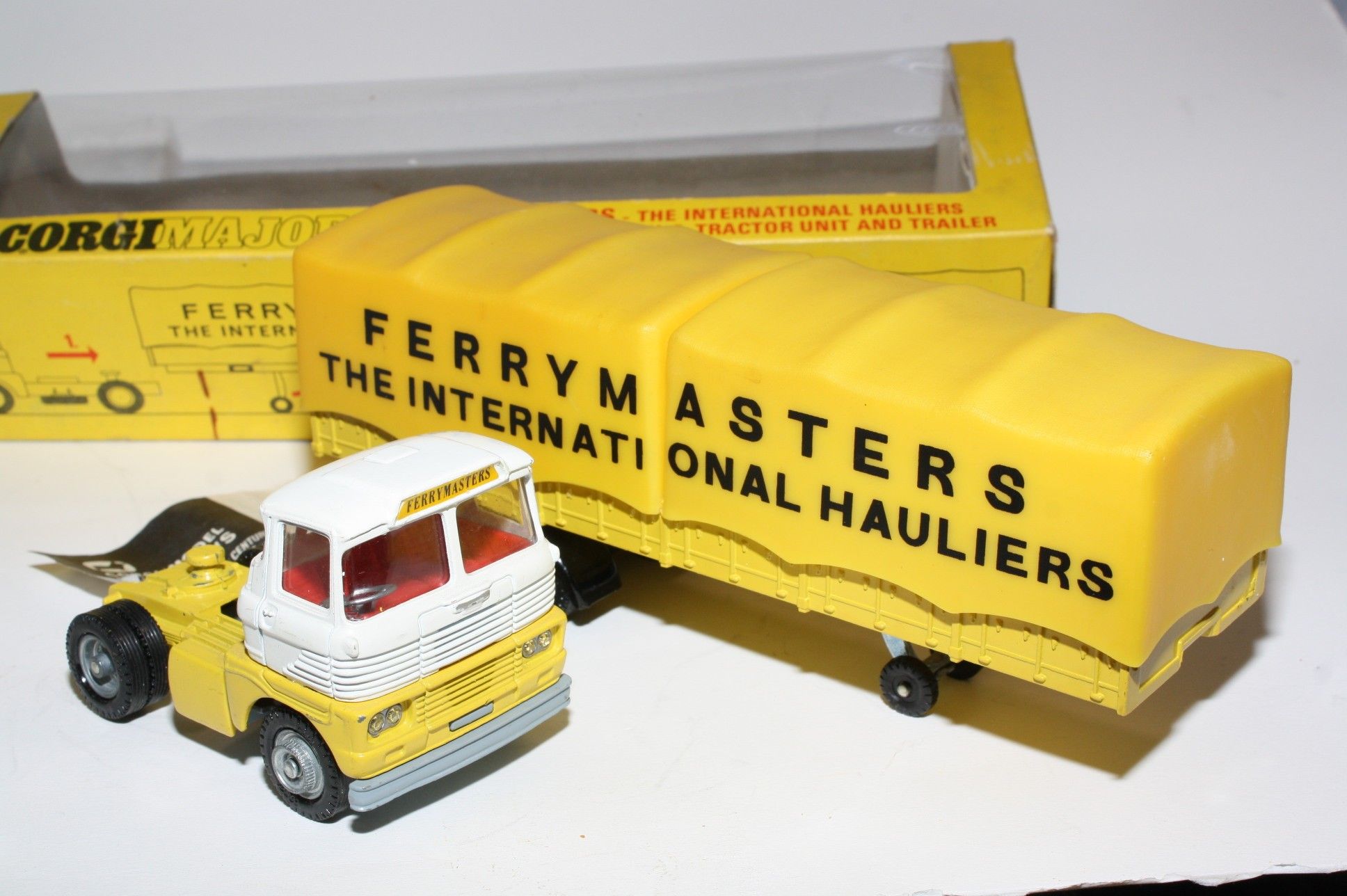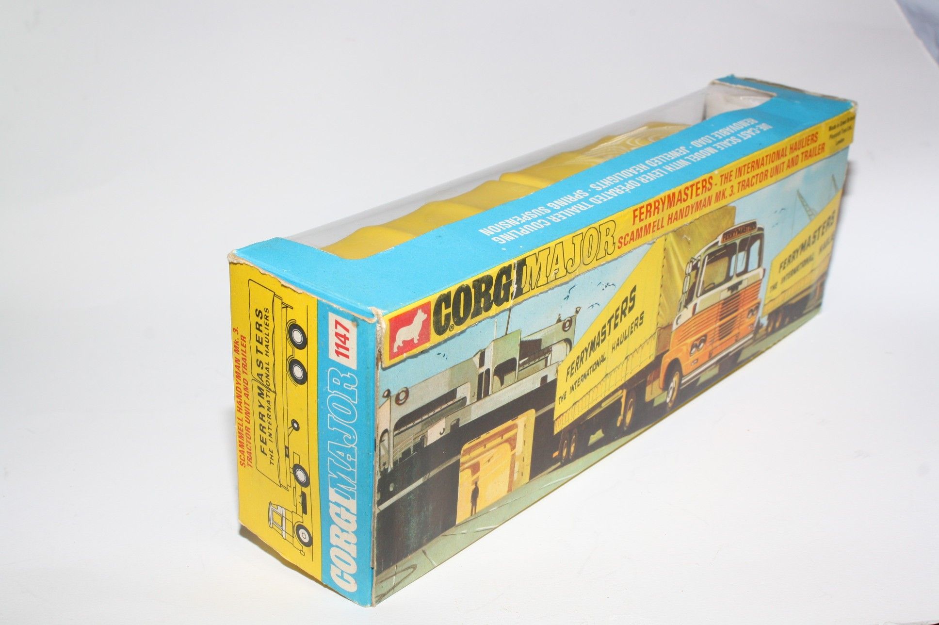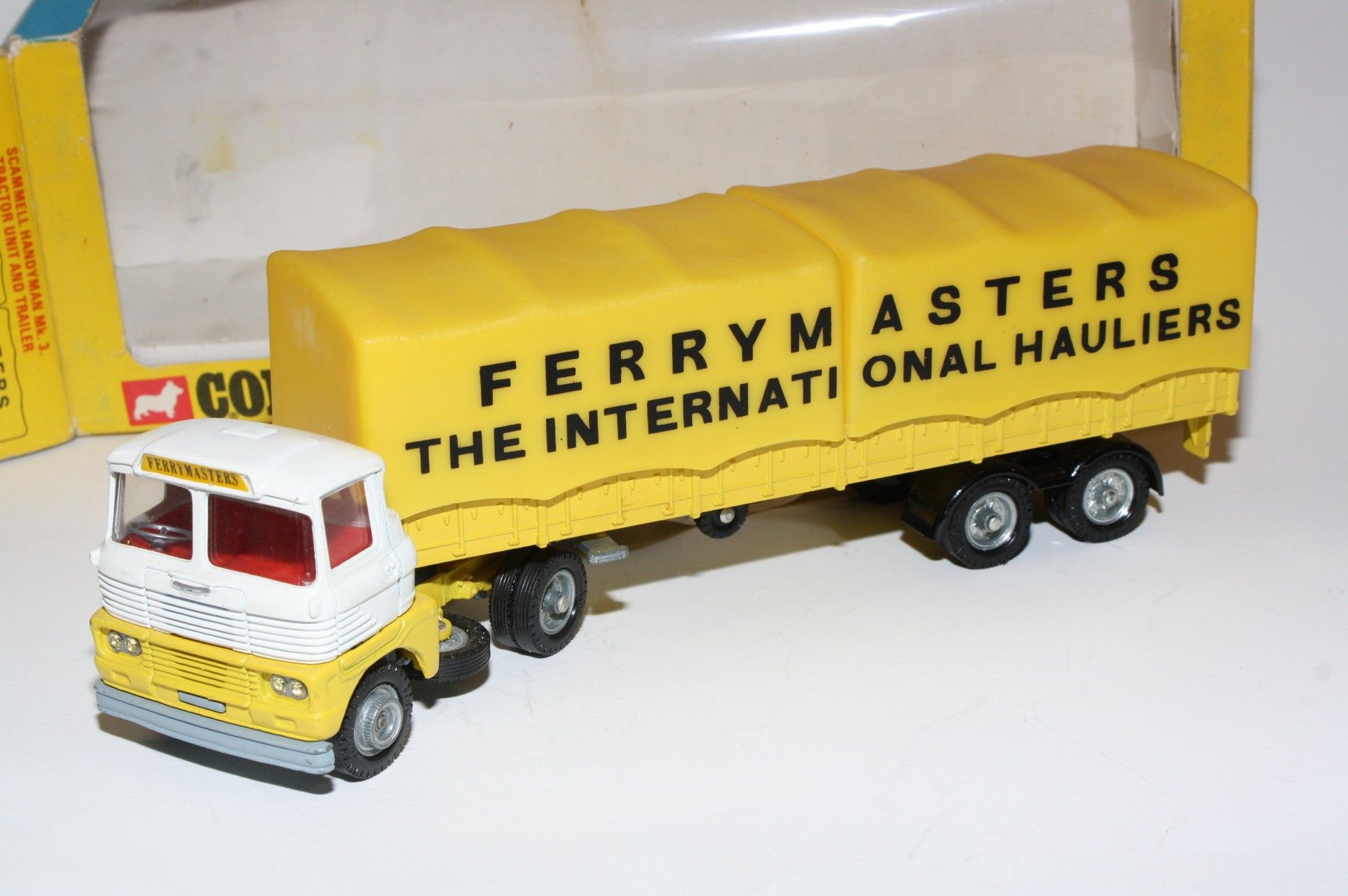 A superb example of this Corgi Commercial. Gleaming original white and yellow paintwork is excellent with just a few tiny chips, please study the photos for exact condition . All original tyres on bright cast hubs, interior and crystal clear windows. Coupling, jewelled headlights, excellent plastic tilts, rear plastic leaf springs missing a couple of halves as is usual but still sits fine. Underside is excellent.