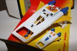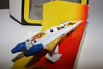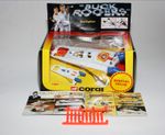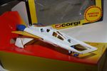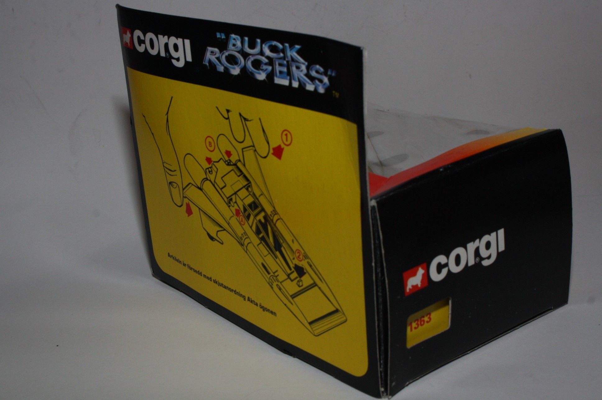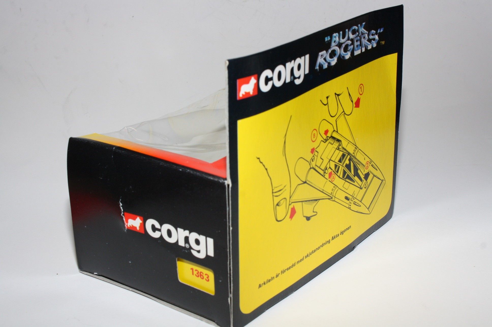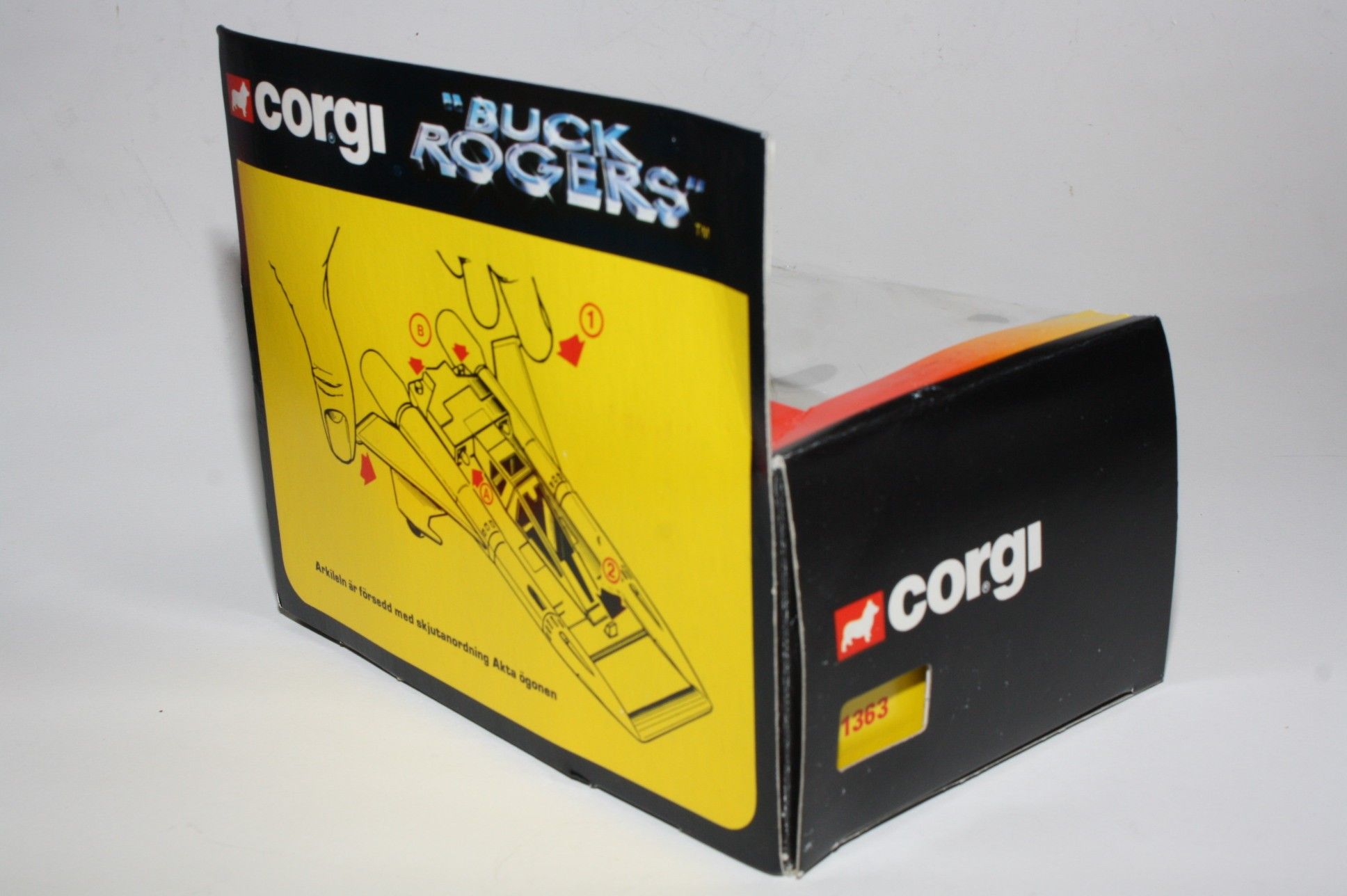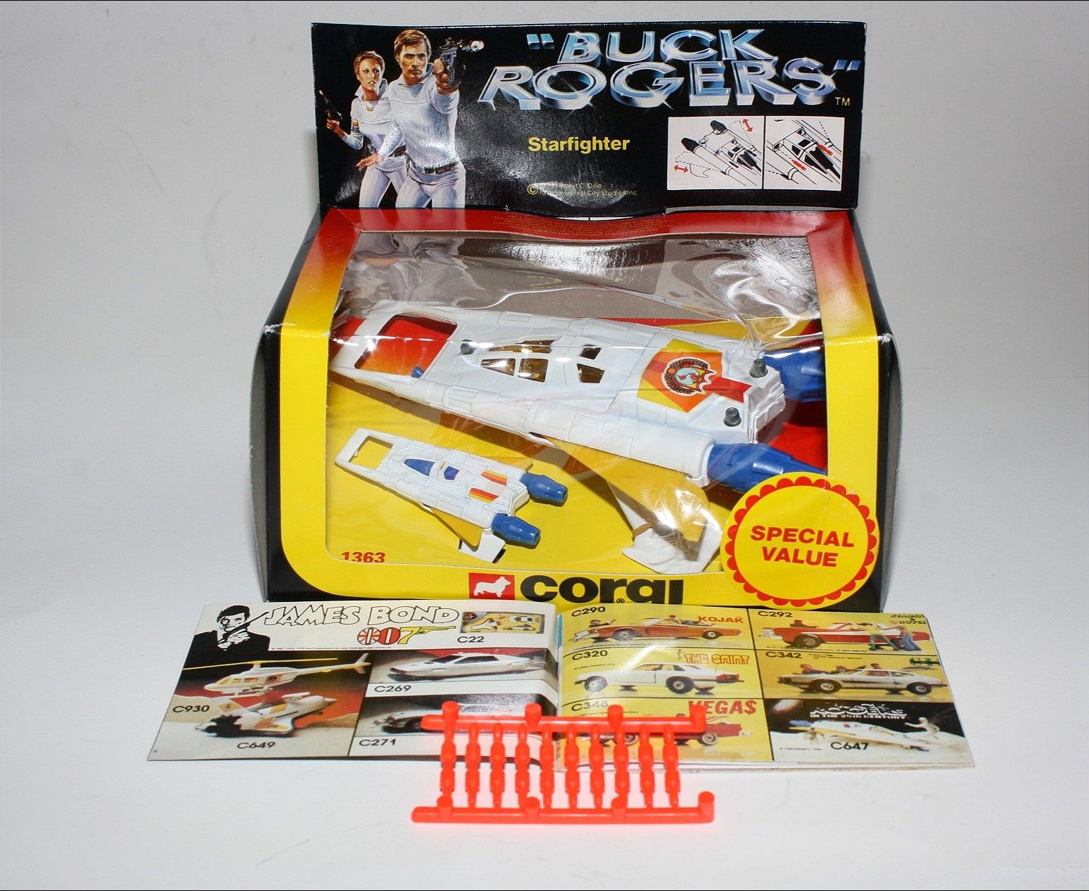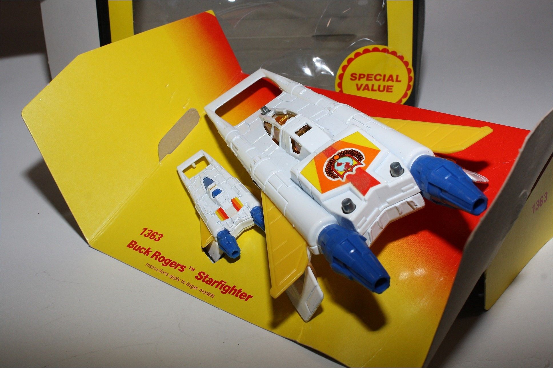 A superb example of this sort after Corgi Buck Rogers set, I have acquired a number of these ex shop stock sets. Gleaming white paintwork is virtually mint on both Starfighters, one tiny chip to front wing corner (larger model), please study the photos for exact condition. All features full working with mint stickers. Still attached to plinth with original band. Comes with original unused sprue with missiles and correct period catalogue supplied with set.