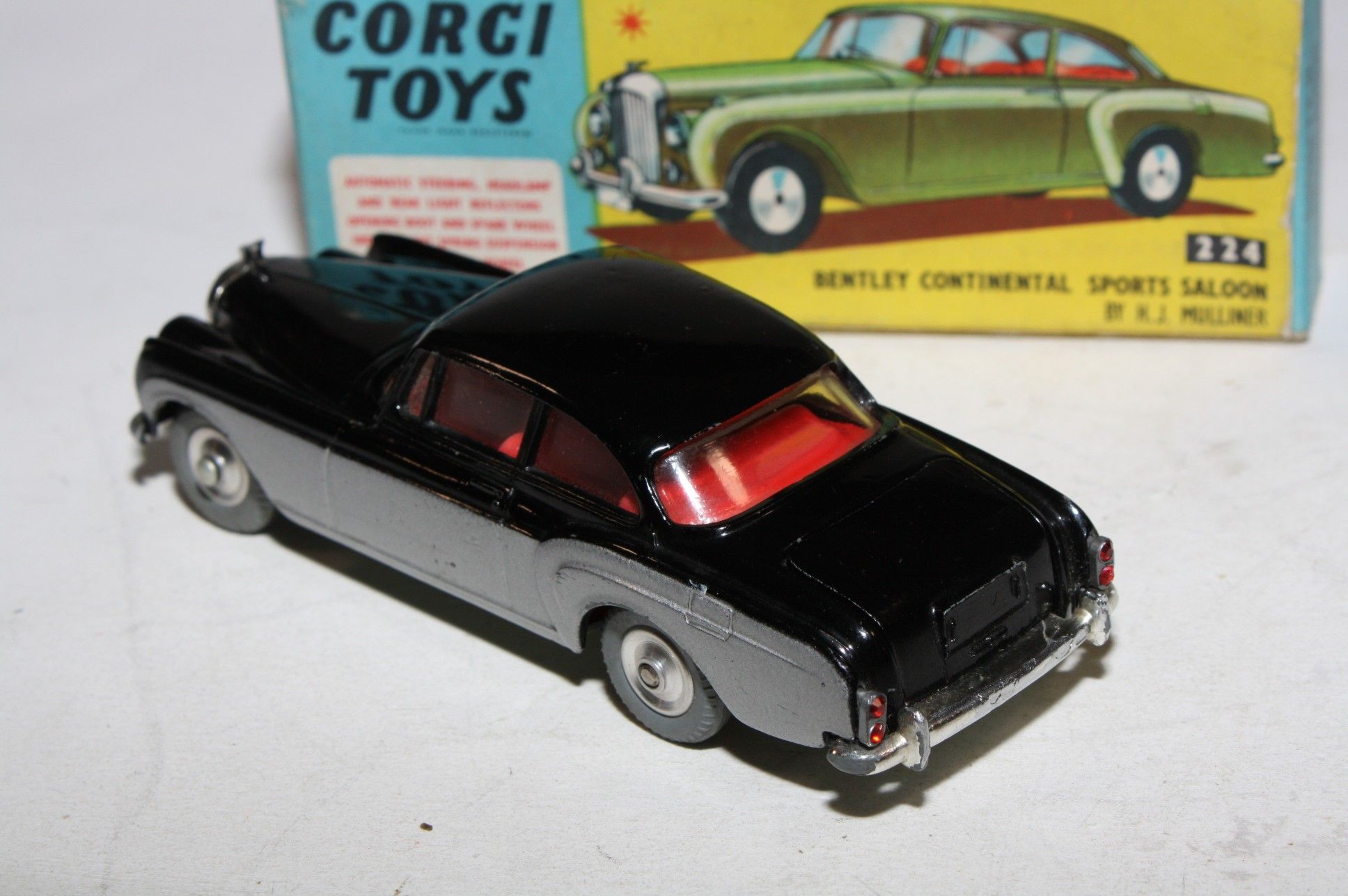 A superb example of this lovely Corgi model. Gleaming black over silver paintwork is virtually mint, just a couple of tiny nicks, please study the photos for exact condition. perfect original grey tyres including spare in boot on smooth perfect Glidamatic suspension and steering, crystal clear windows, red interior, mascot present, great chrome, jewelled headlights present, all 4 jewelled rear lights present. Mint grey baseplate.