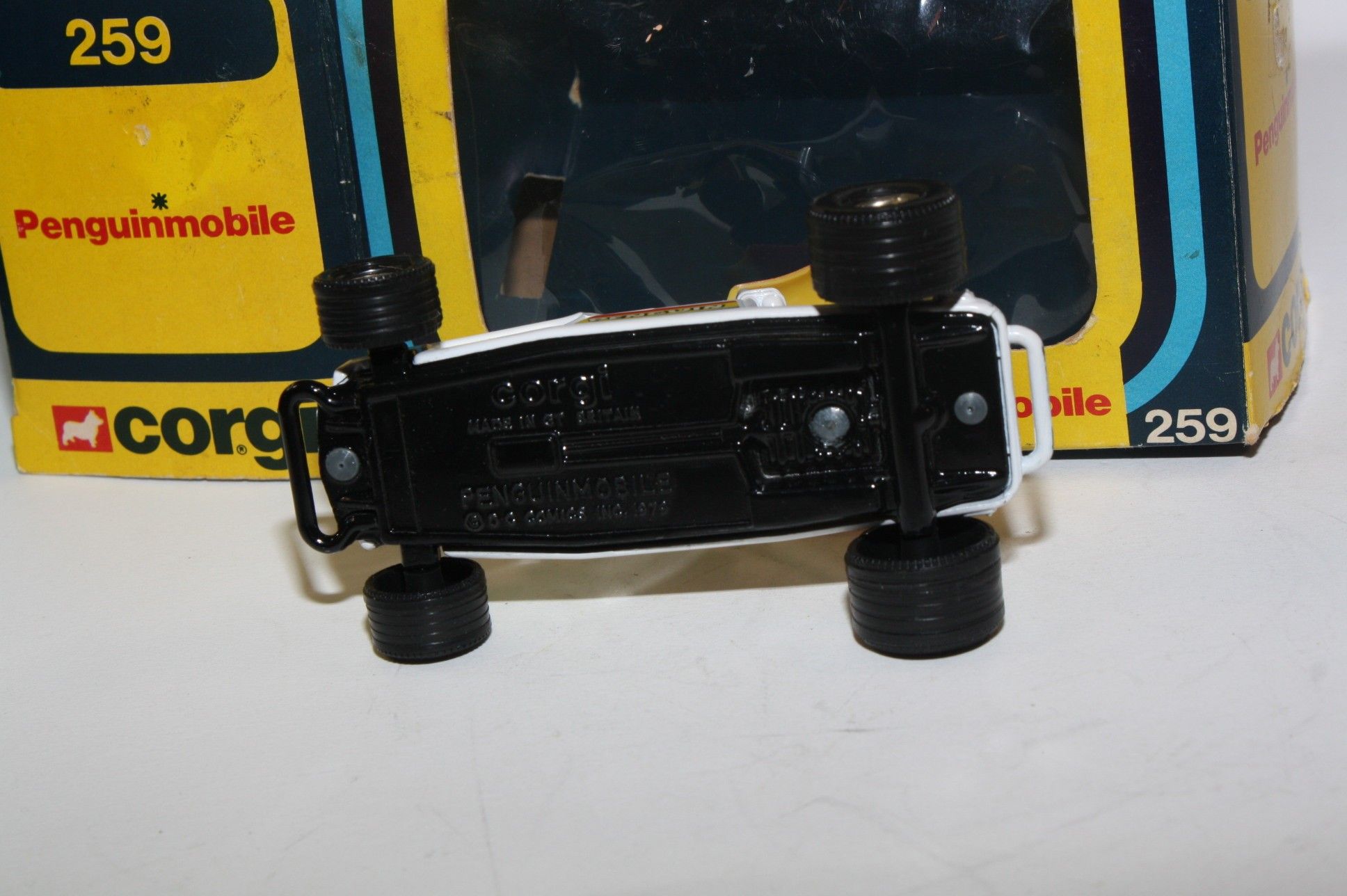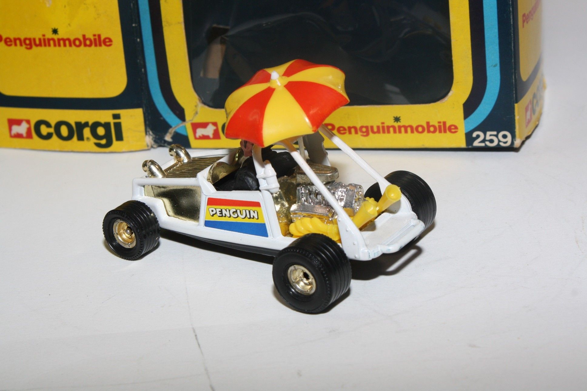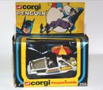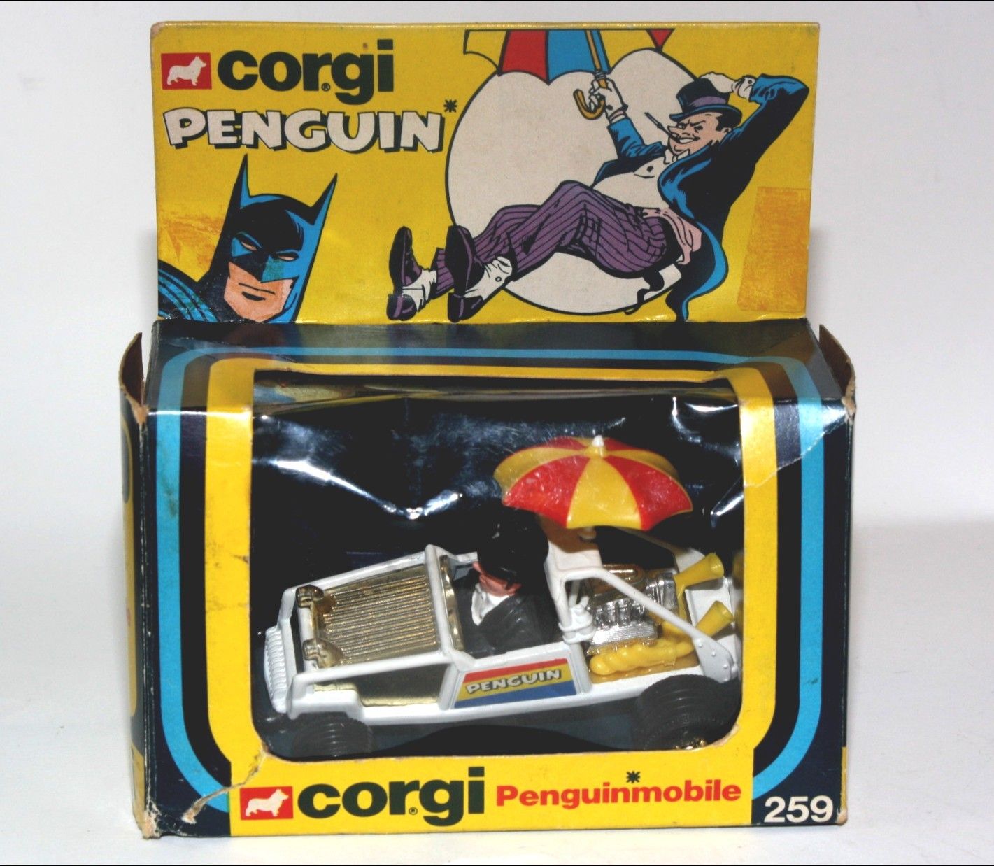 A superb example of this vintage Corgi Penguinmobile model from the Batman series. Gleaming white paintwork is near mint, please study the photos for exact condition. Perfect wheels, good gold and silver, original decals, penguin figure and original umbrella. Superb underside