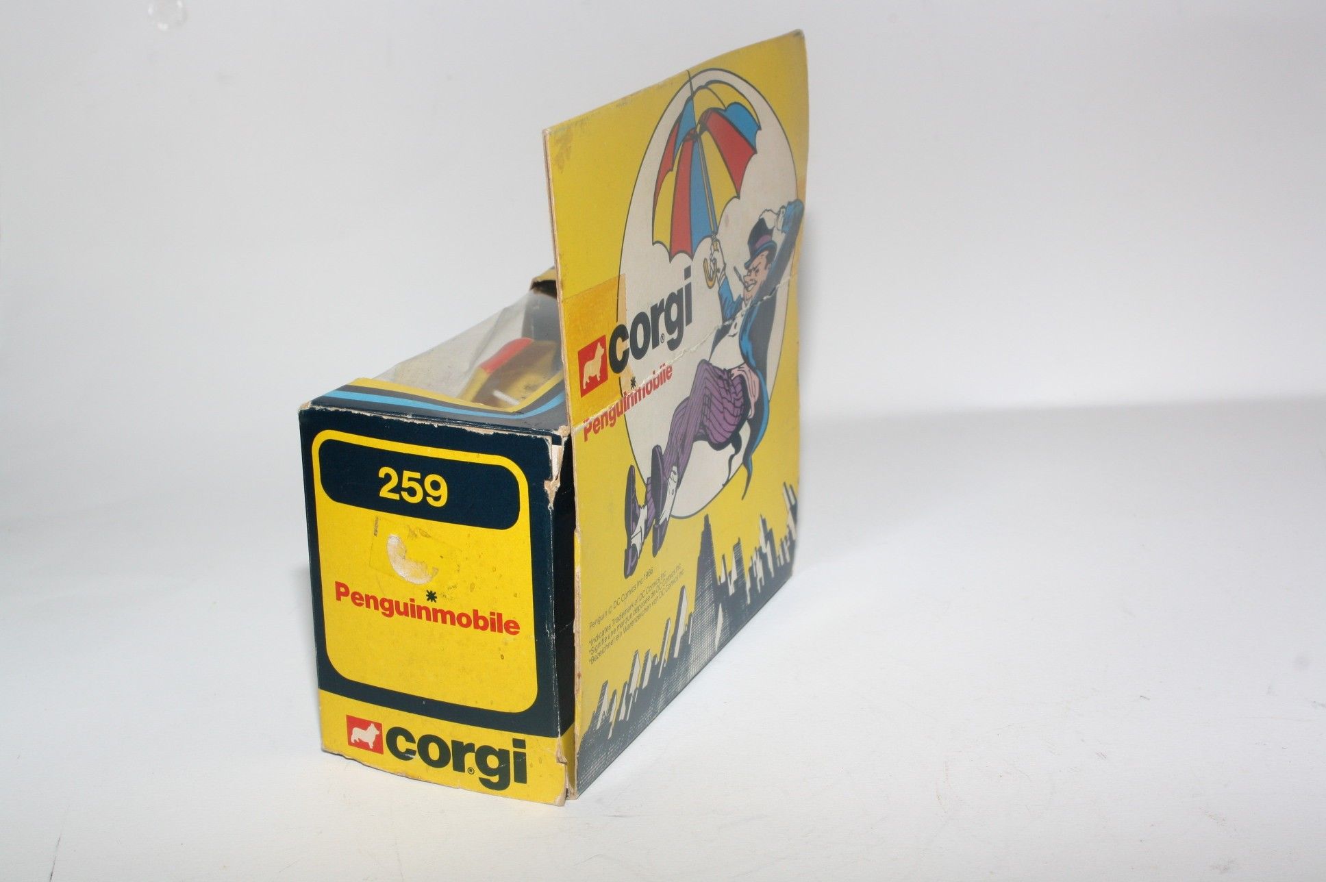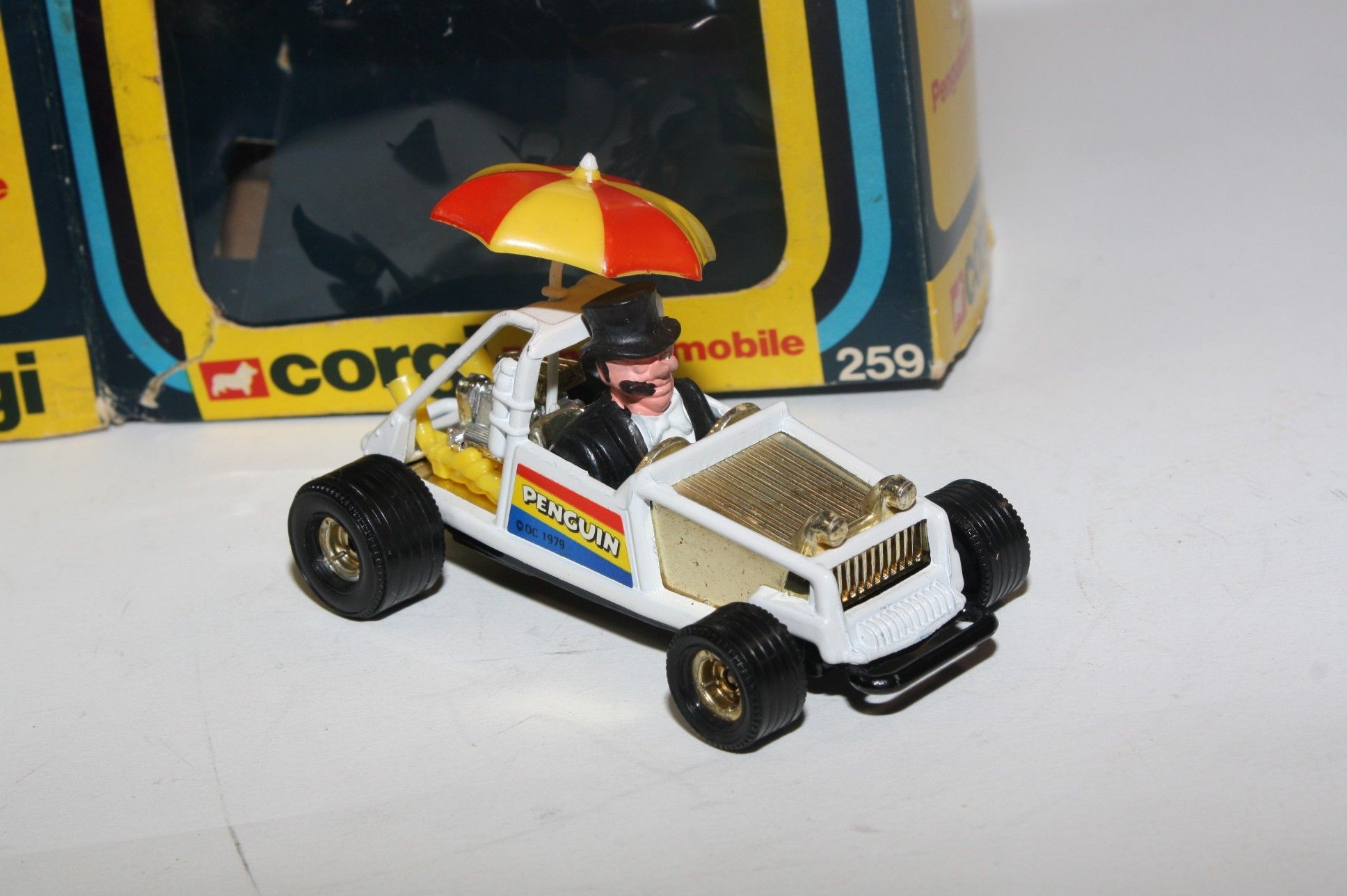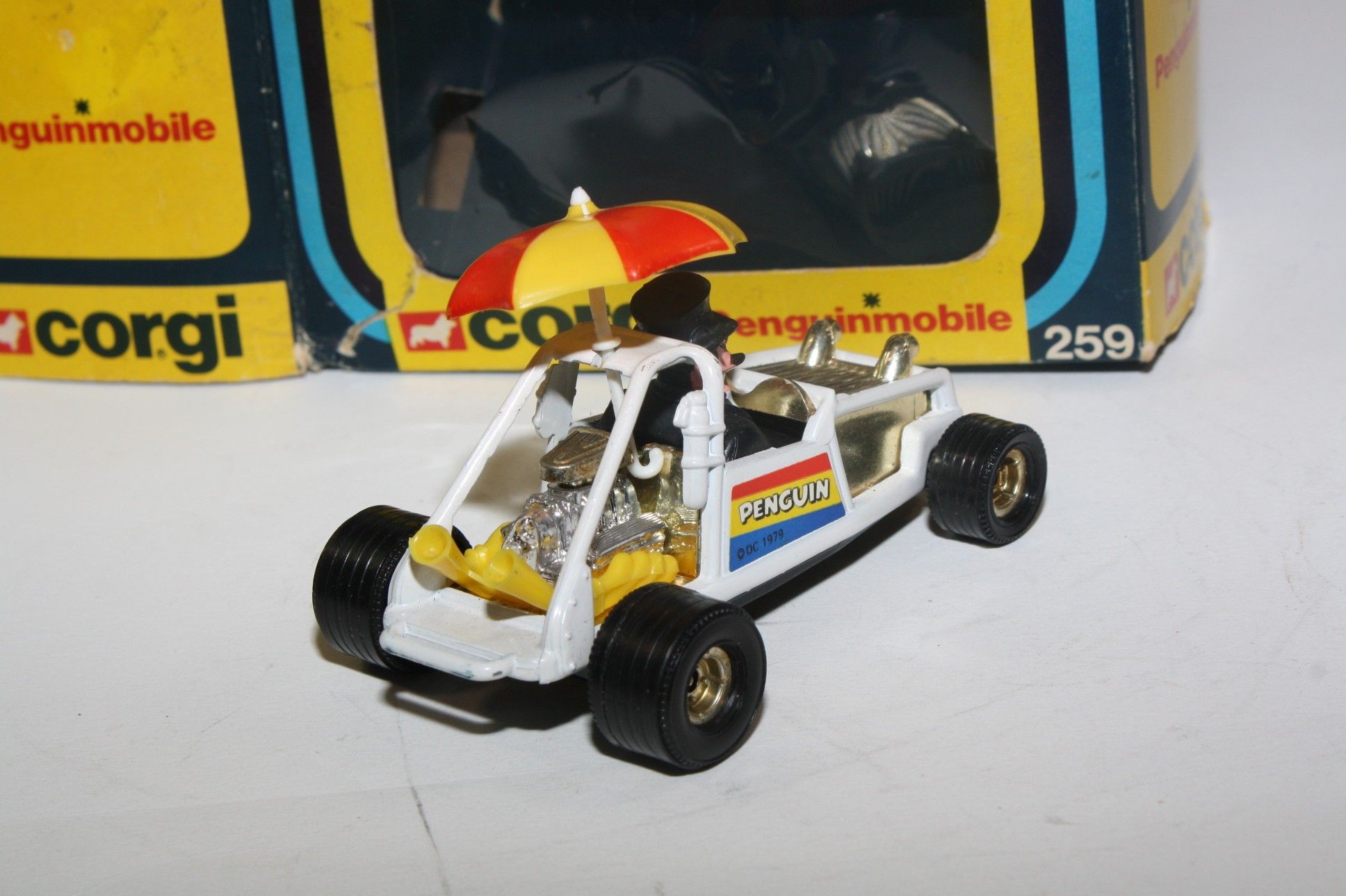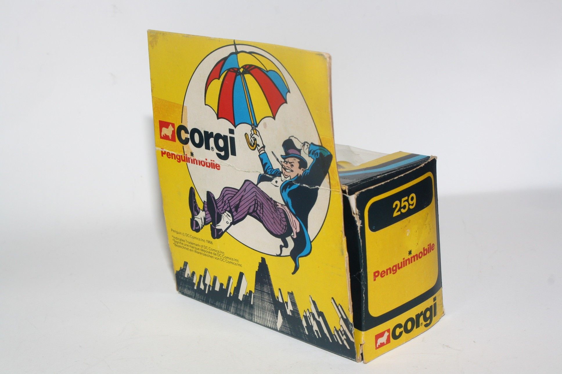 A superb example of this vintage Corgi Penguinmobile model from the Batman series. Gleaming white paintwork is near mint, please study the photos for exact condition. Perfect wheels, good gold and silver, original decals, penguin figure and original umbrella. Superb underside