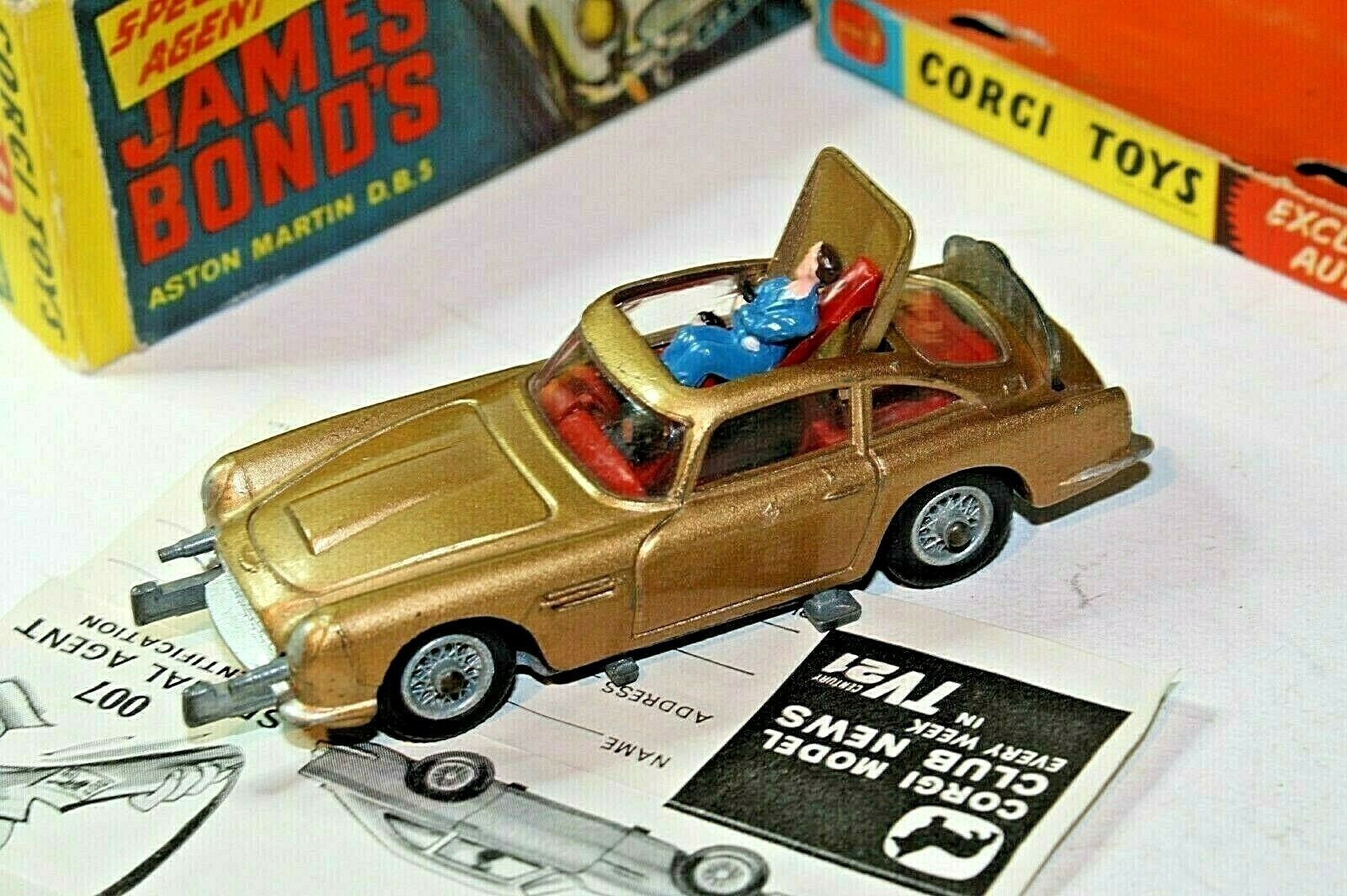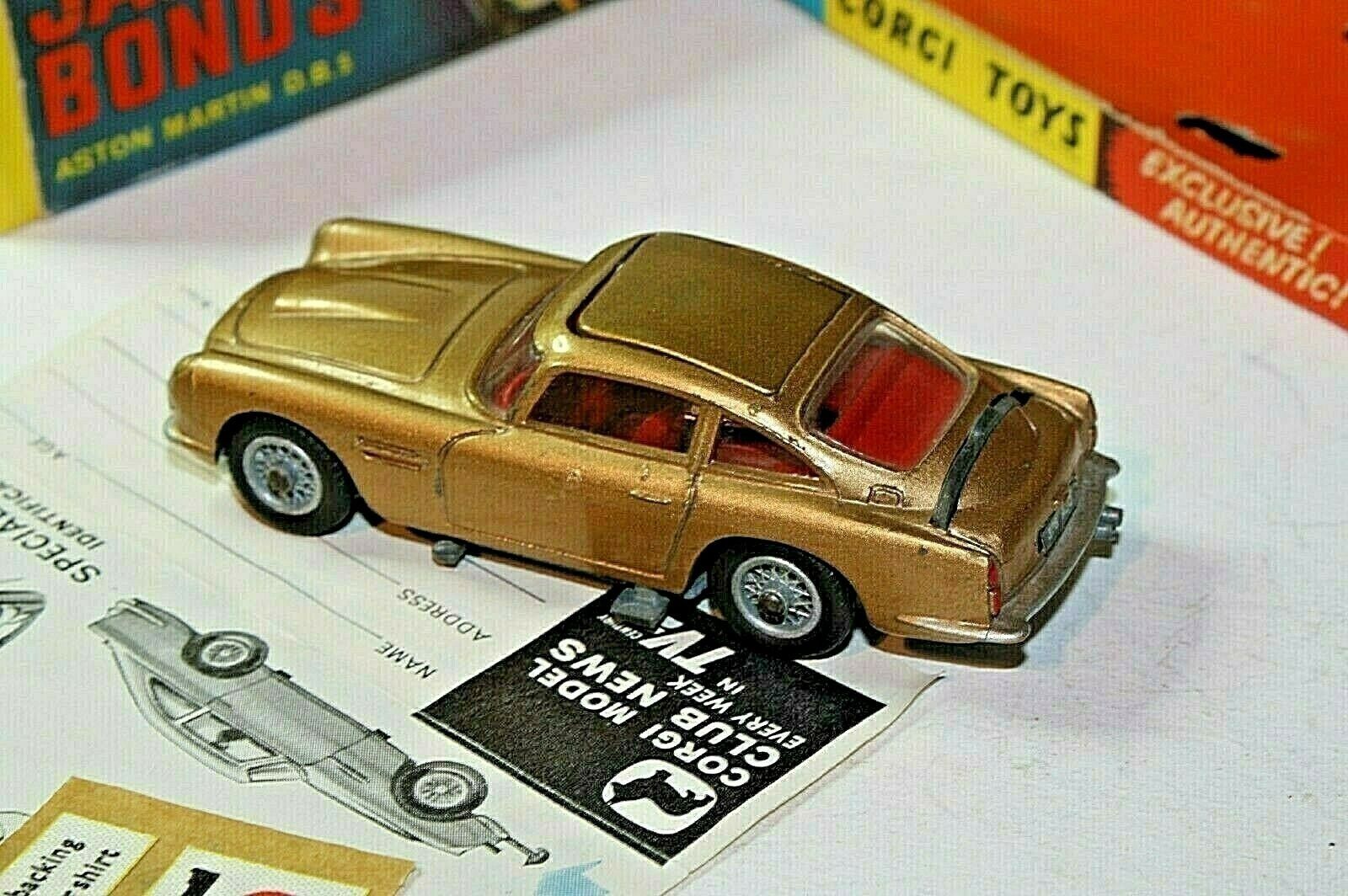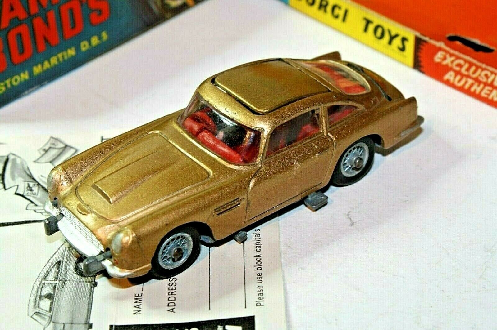 A beautiful example of this iconic Corgi James Bond model. Excellent paintwork with just a couple of small touch ins, please study the photos for exact condition. All original tyres and spoked hubs,all suspension is perfect. Clear windows and perfect interior with James Bond figure present. All features work well, machine guns, rear shield and ejector seat all good. Base plate very good. 2 x original bandit figures included.