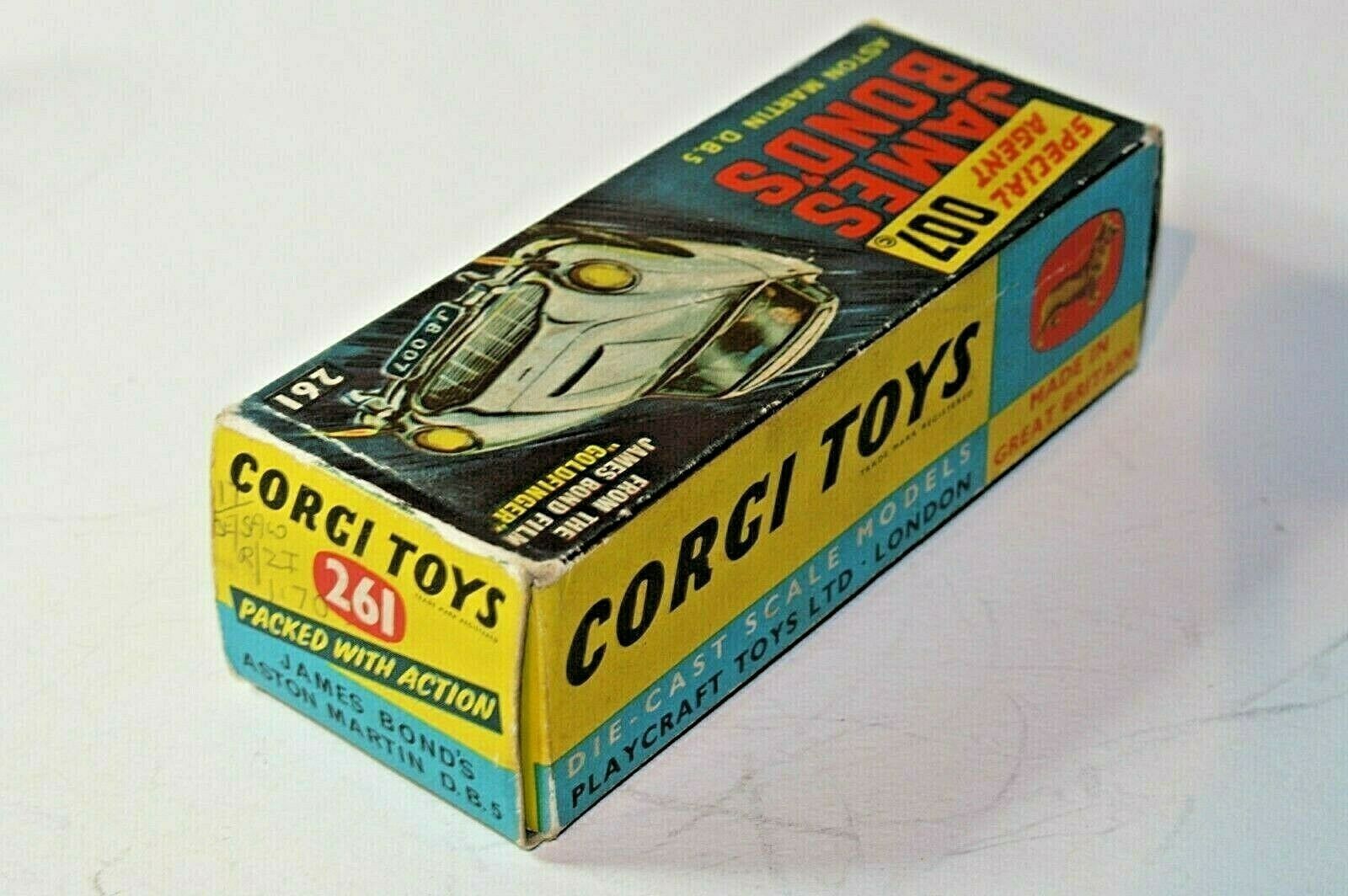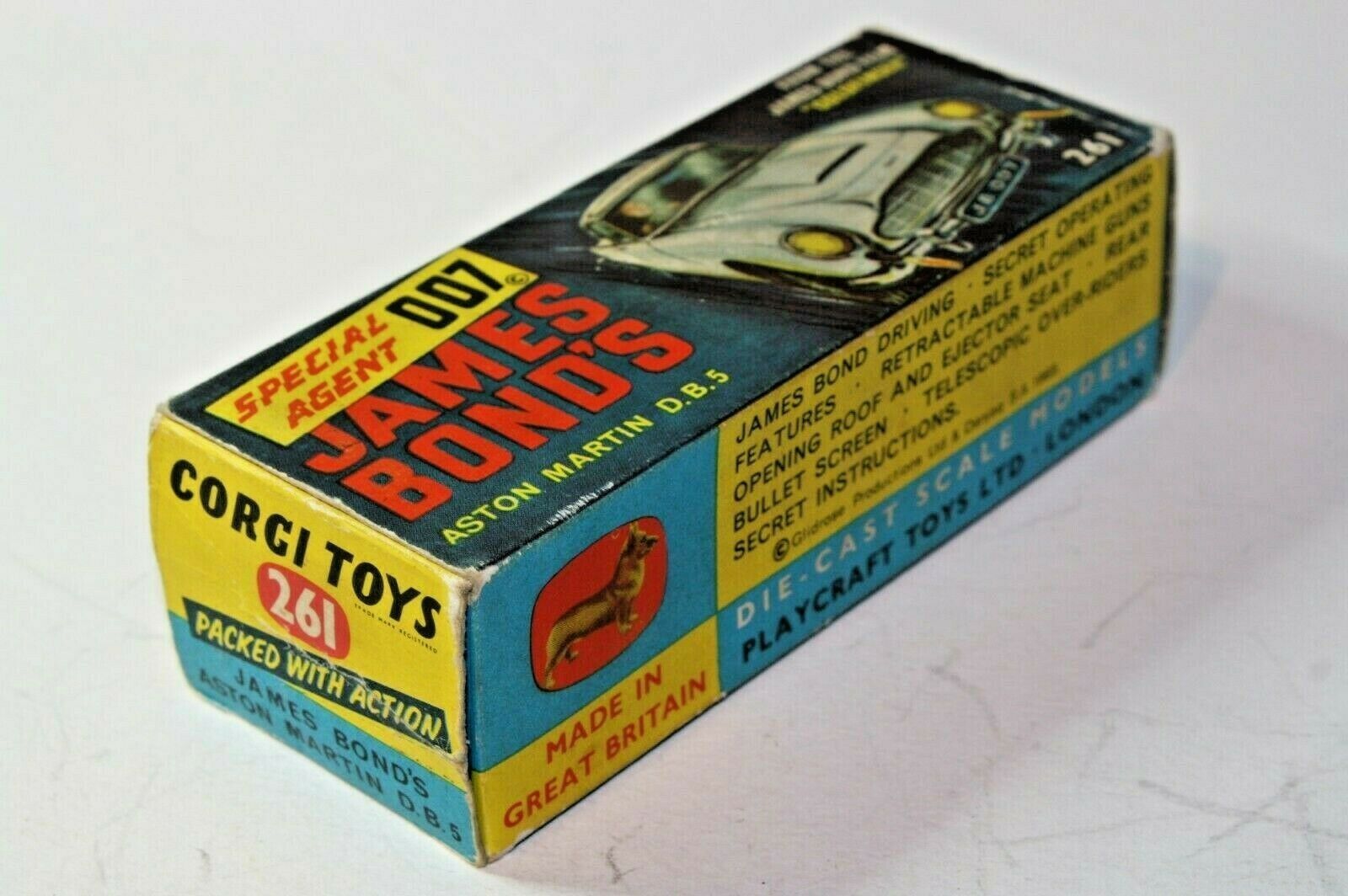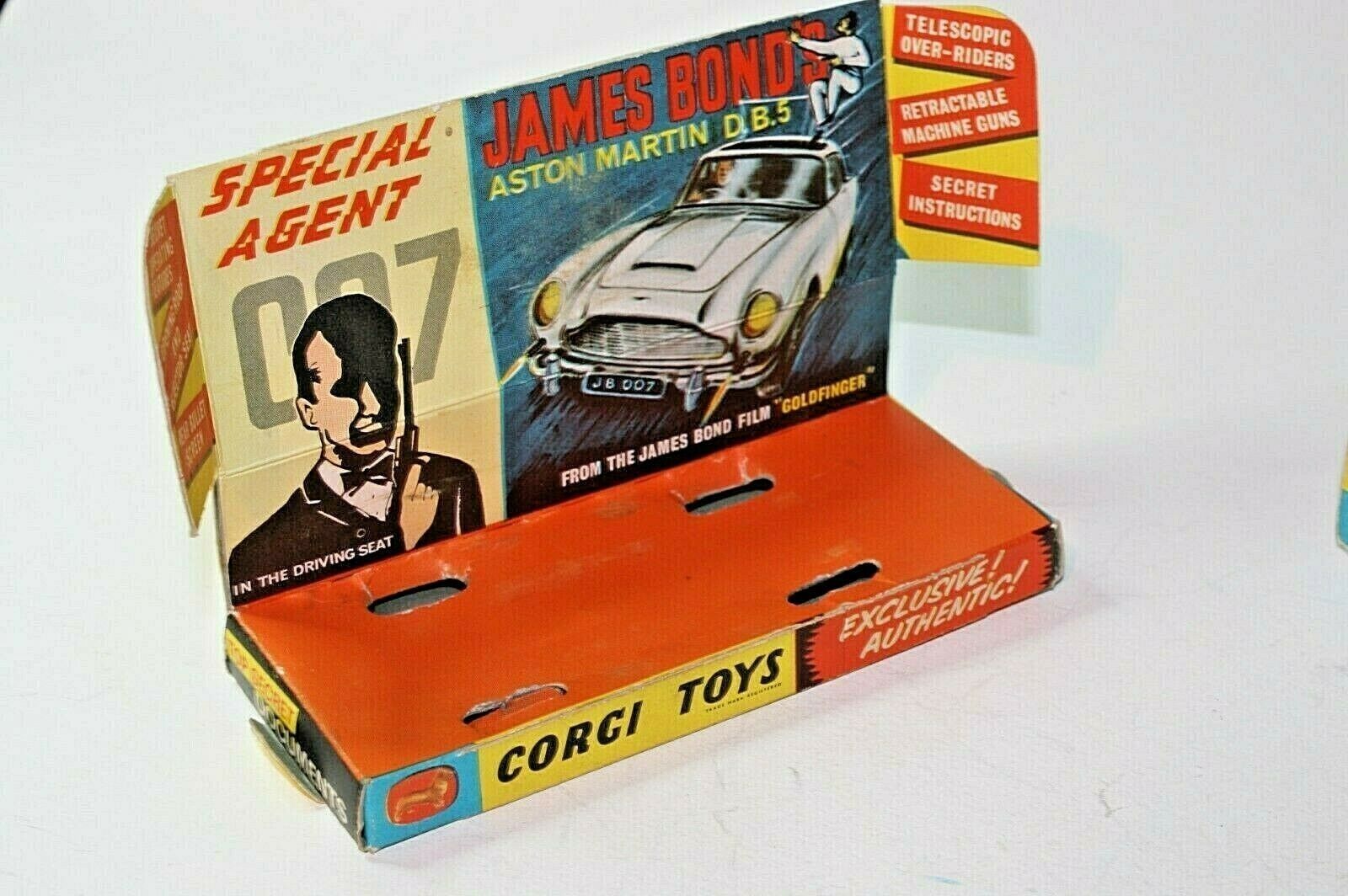 A beautiful example of this iconic Corgi James Bond model. Excellent paintwork with just a couple of small touch ins, please study the photos for exact condition. All original tyres and spoked hubs,all suspension is perfect. Clear windows and perfect interior with James Bond figure present. All features work well, machine guns, rear shield and ejector seat all good. Base plate very good. 2 x original bandit figures included.
