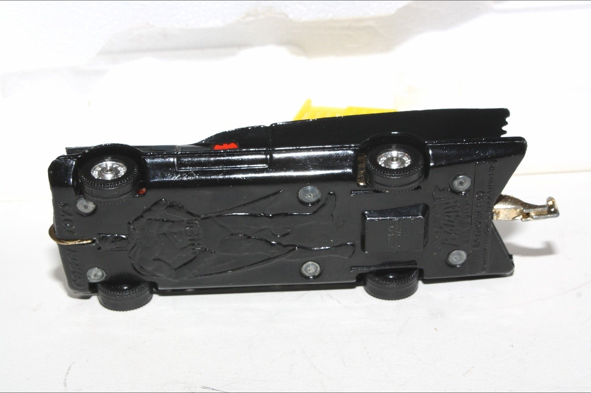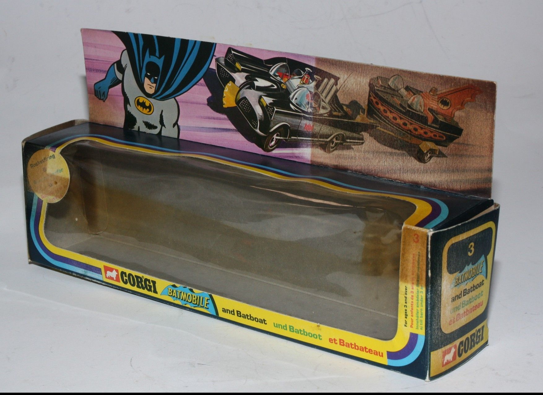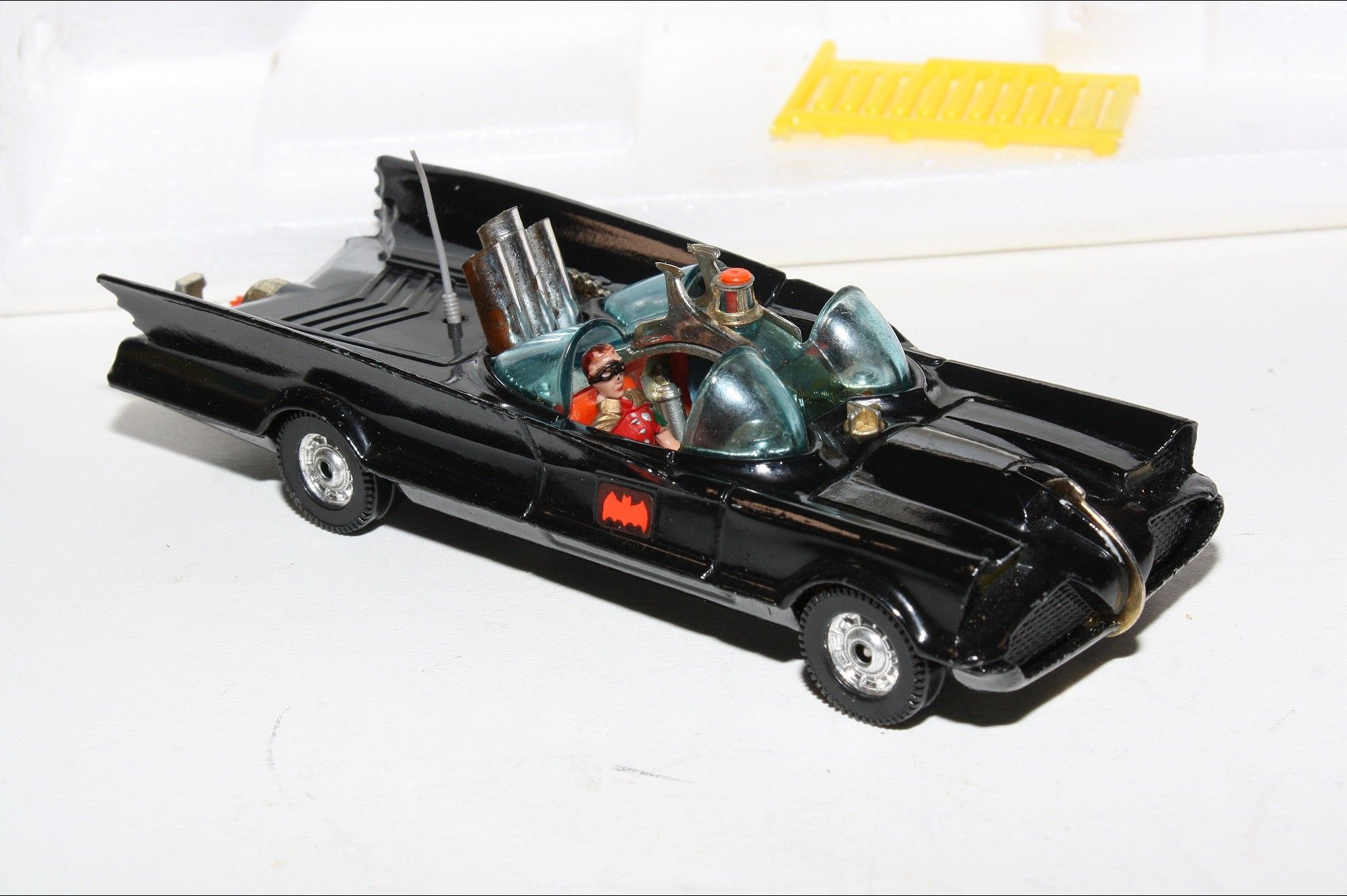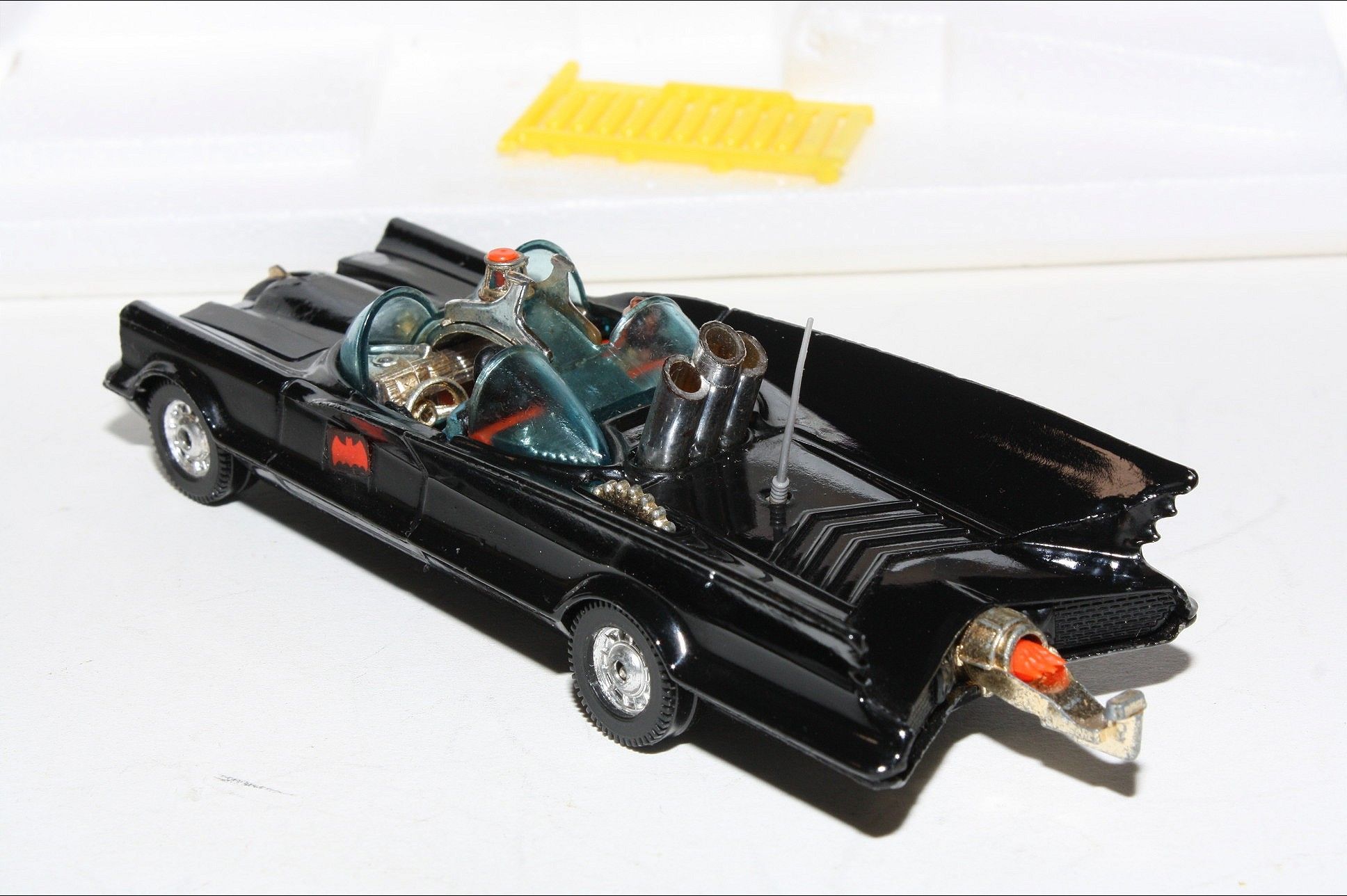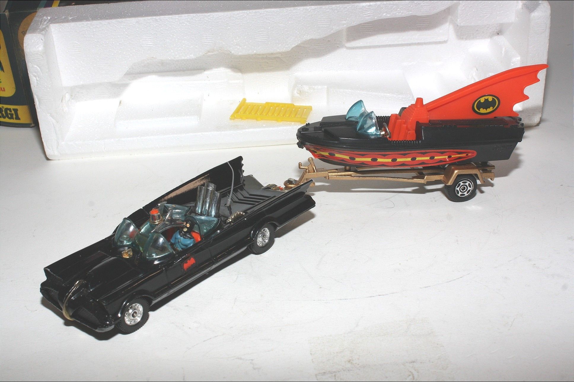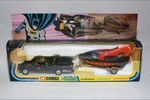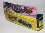 A superb example of this 3rd Issue iconic and fast appreciating Batmobile & Batboat giftset. Gleaming original gloss paintwork is excellent, just a couple of tiny nicks, please study the photos. All perfect chrome Whizzwheels, good suspension all round, perfect blue cockpit windscreens with no cracks, original Batman and Robin figures present, roof beacon, all features working, rocket launchers and chain cutter, tow hook with static flame, Bat logos on doors present and excellent, original aerial present and good underside. Comes with full sprue.
