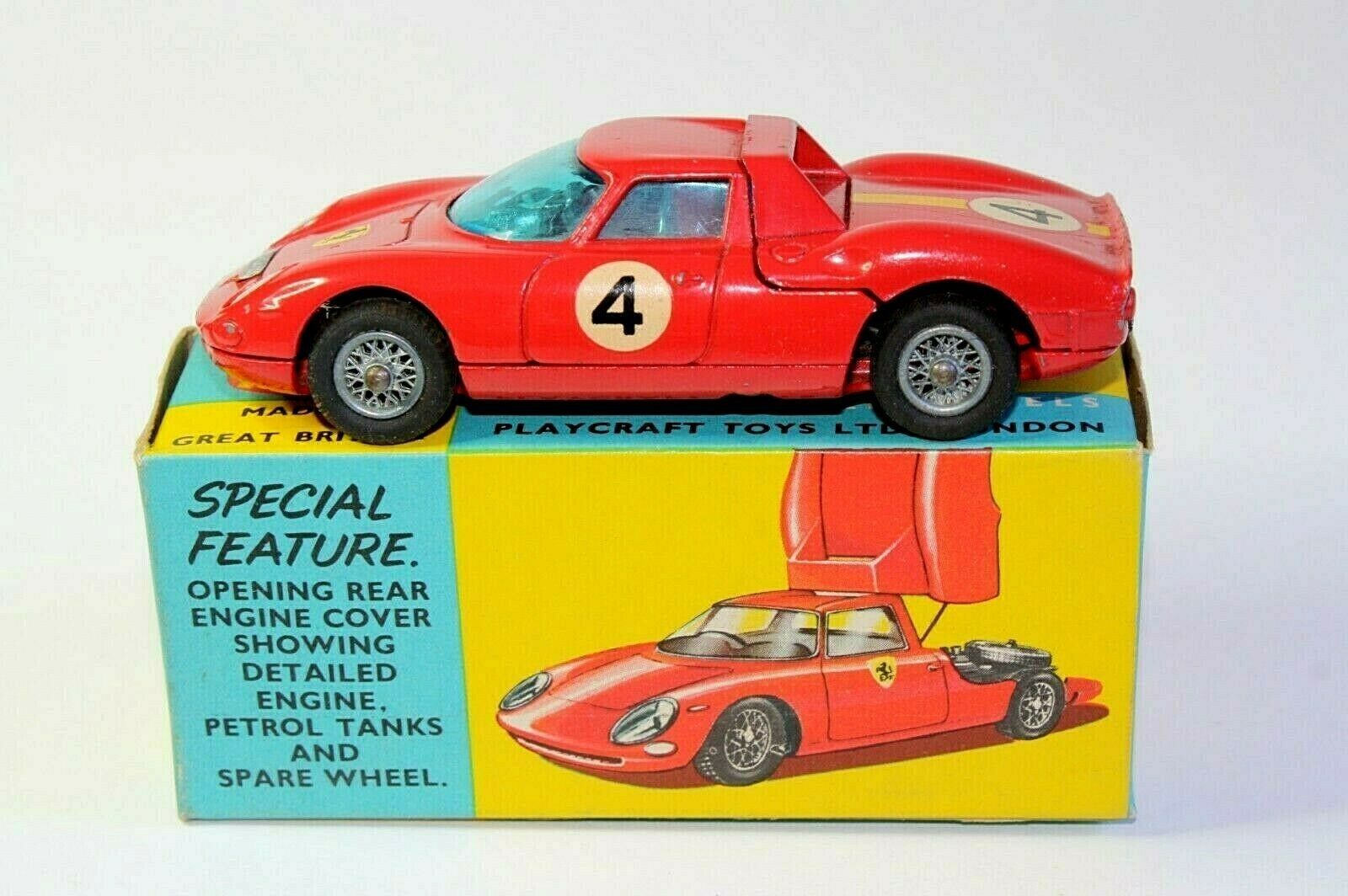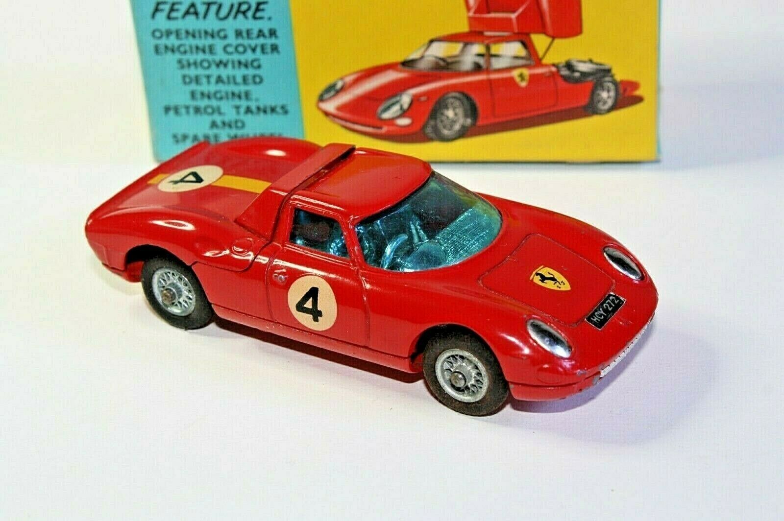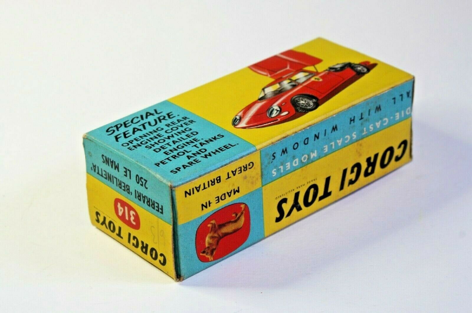 Manufactured 1965-1972 A very good example of this 1960's Corgi model. Original red paintwork is very good with just a few tiny chips, please study the high resolution photos for exact condition. Perfect original tyres on spoked hubs, good suspension, crystal clear windows, perfect interior, decals perfect, engine bay good, good chrome, underside has paint loss on raisded edges. Comes with its original yellow and blue card box which is all complete and in excellent crisp condition. 6/3 in faint pencil on one endflap and very slight creasing to the other, nice bright colours, please study the photos. Any questions, please ask Happy to ship worldwide Combined shipping a pleasure Please take a look at my other Corgi and vintage toy listings Corgi 314 Ferrari Le Mans