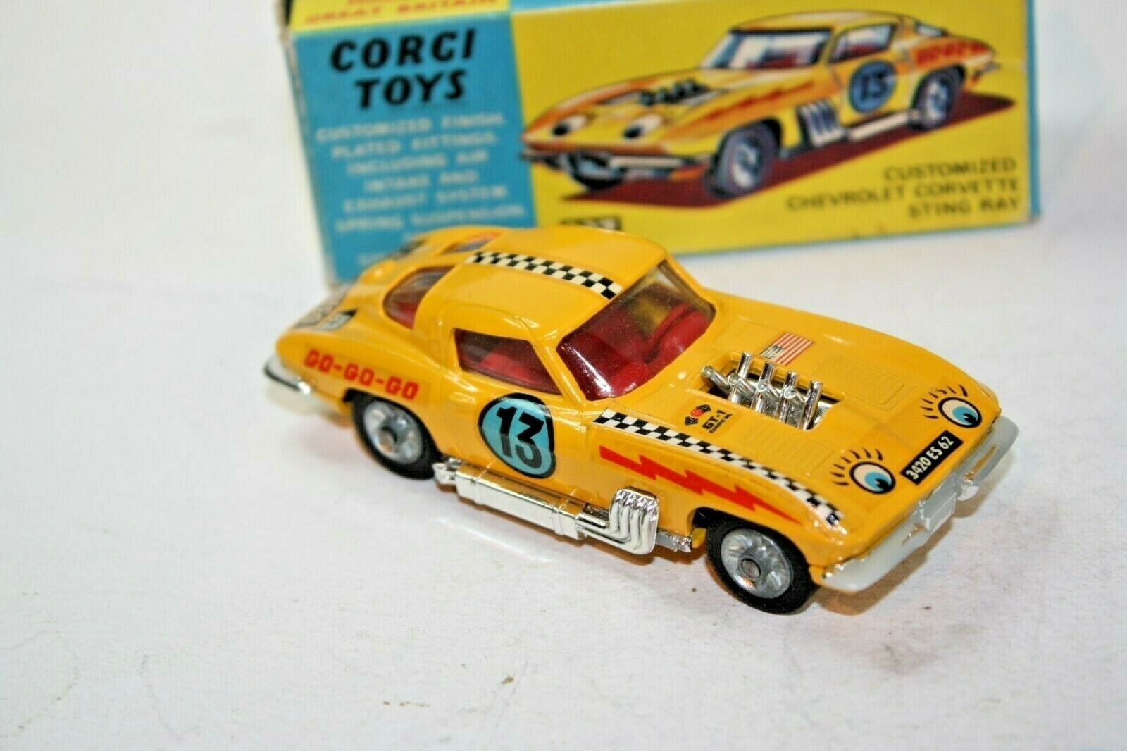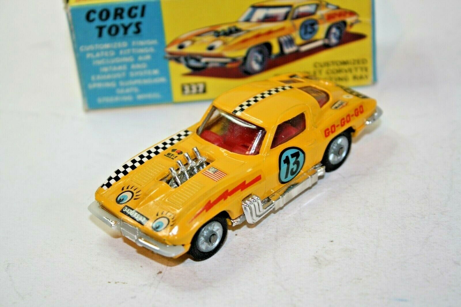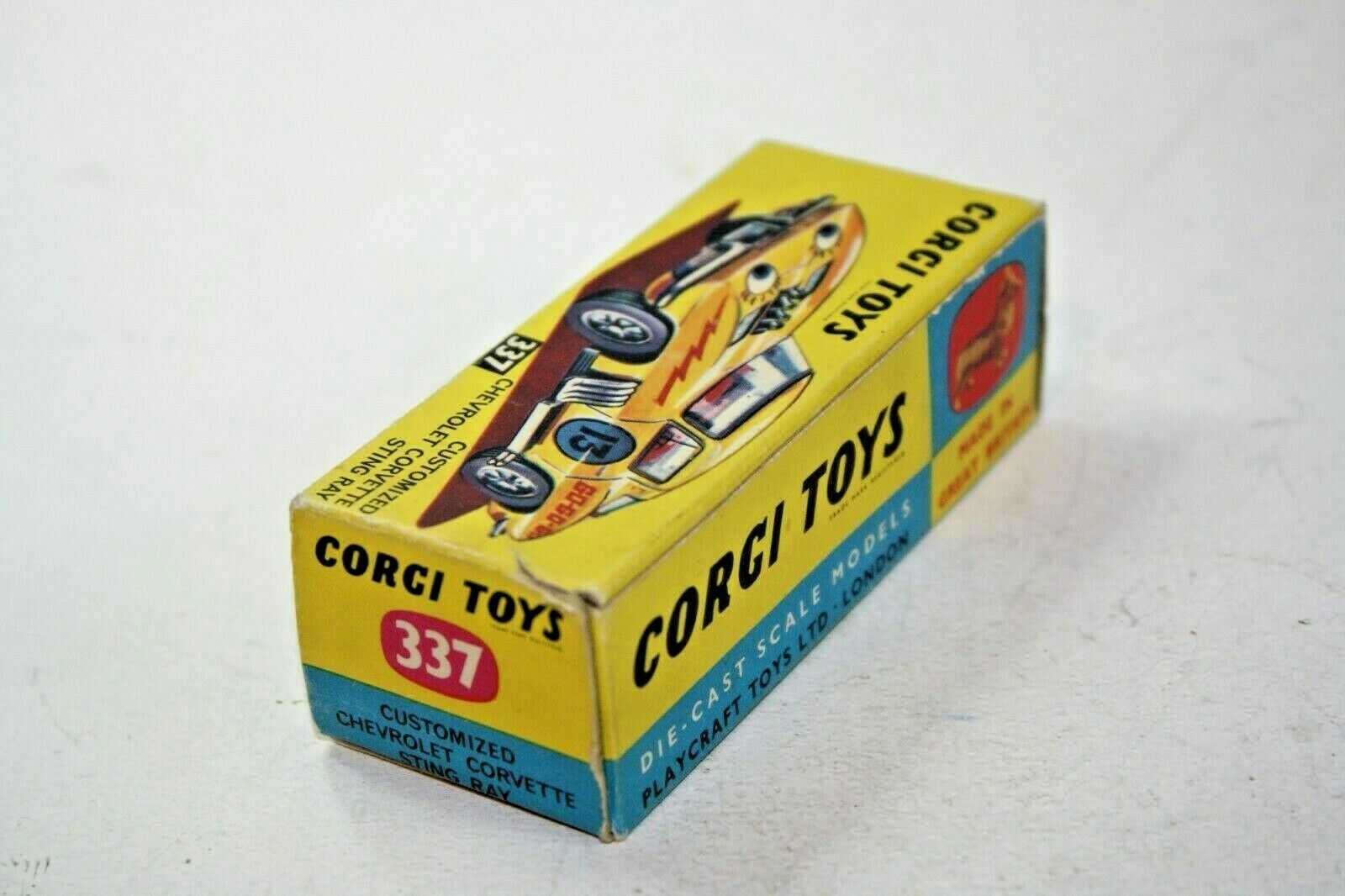 Manufactured 1967-1969 A superb example of this Corgi stock car model from the 1960's. Excellent gleaming paintwork is mint, please study the photos for exact condition. All original tyres on cast hubs, suspension great, crystal clear windows and red interior, some loss to chrome bumpers front and back which is usual, perfect body decals, baseplate is mint. A lovely example. Comes with its original box which is good and all complete with all flaps attached. Quite crisp but slightly grubby with rubs to some edges and a small tear to one picture side end. Please study the photos. Any questions, please ask Happy to ship worldwide. Combined shipping a pleasure Please take a look at my other listings vintage toy listings Corgi 337 Customized Chevrolet Corvette Sting Ray Stock Car