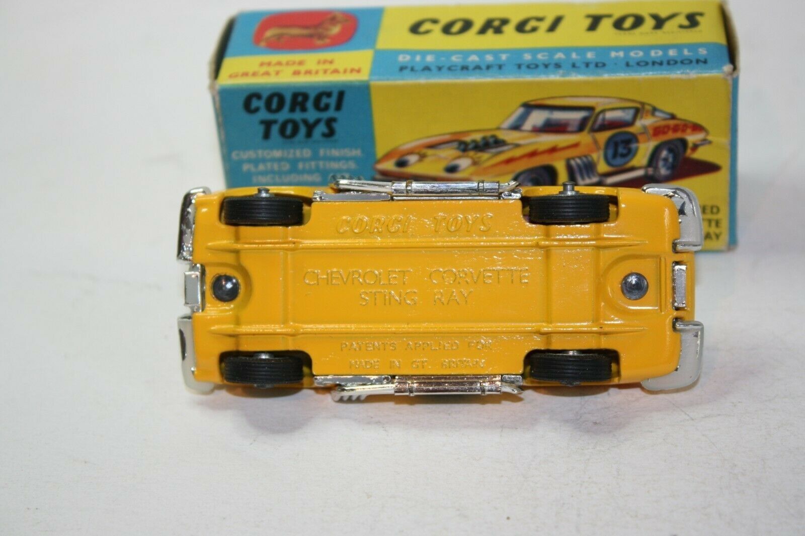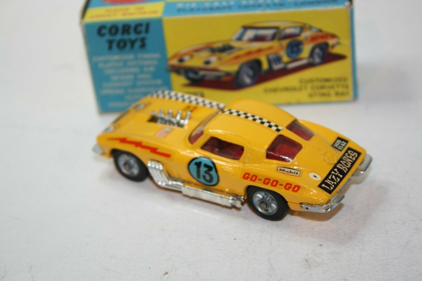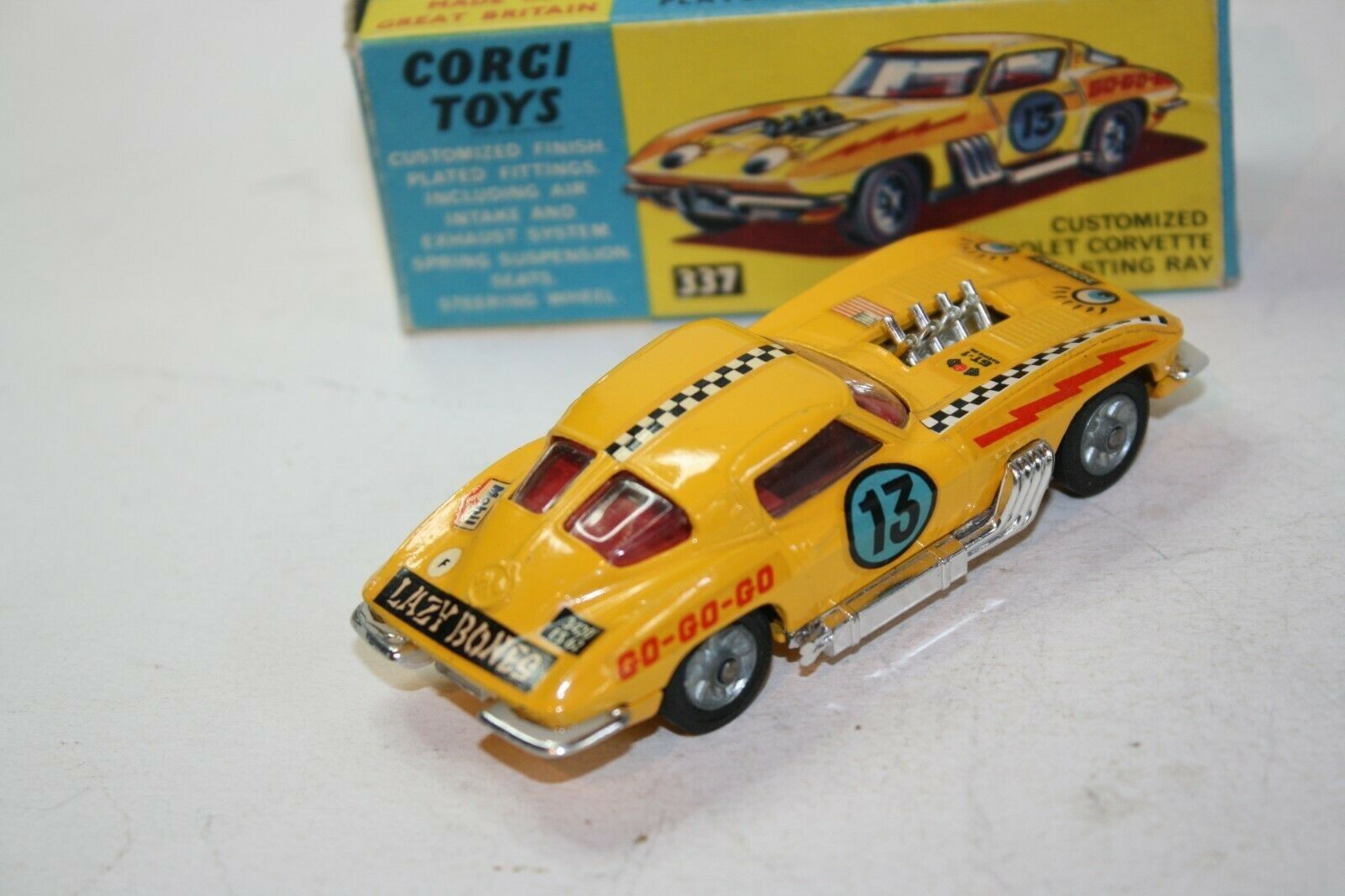 Manufactured 1967-1969 A superb example of this Corgi stock car model from the 1960's. Excellent gleaming paintwork is mint, please study the photos for exact condition. All original tyres on cast hubs, suspension great, crystal clear windows and red interior, some loss to chrome bumpers front and back which is usual, perfect body decals, baseplate is mint. A lovely example. Comes with its original box which is good and all complete with all flaps attached. Quite crisp but slightly grubby with rubs to some edges and a small tear to one picture side end. Please study the photos. Any questions, please ask Happy to ship worldwide. Combined shipping a pleasure Please take a look at my other listings vintage toy listings Corgi 337 Customized Chevrolet Corvette Sting Ray Stock Car