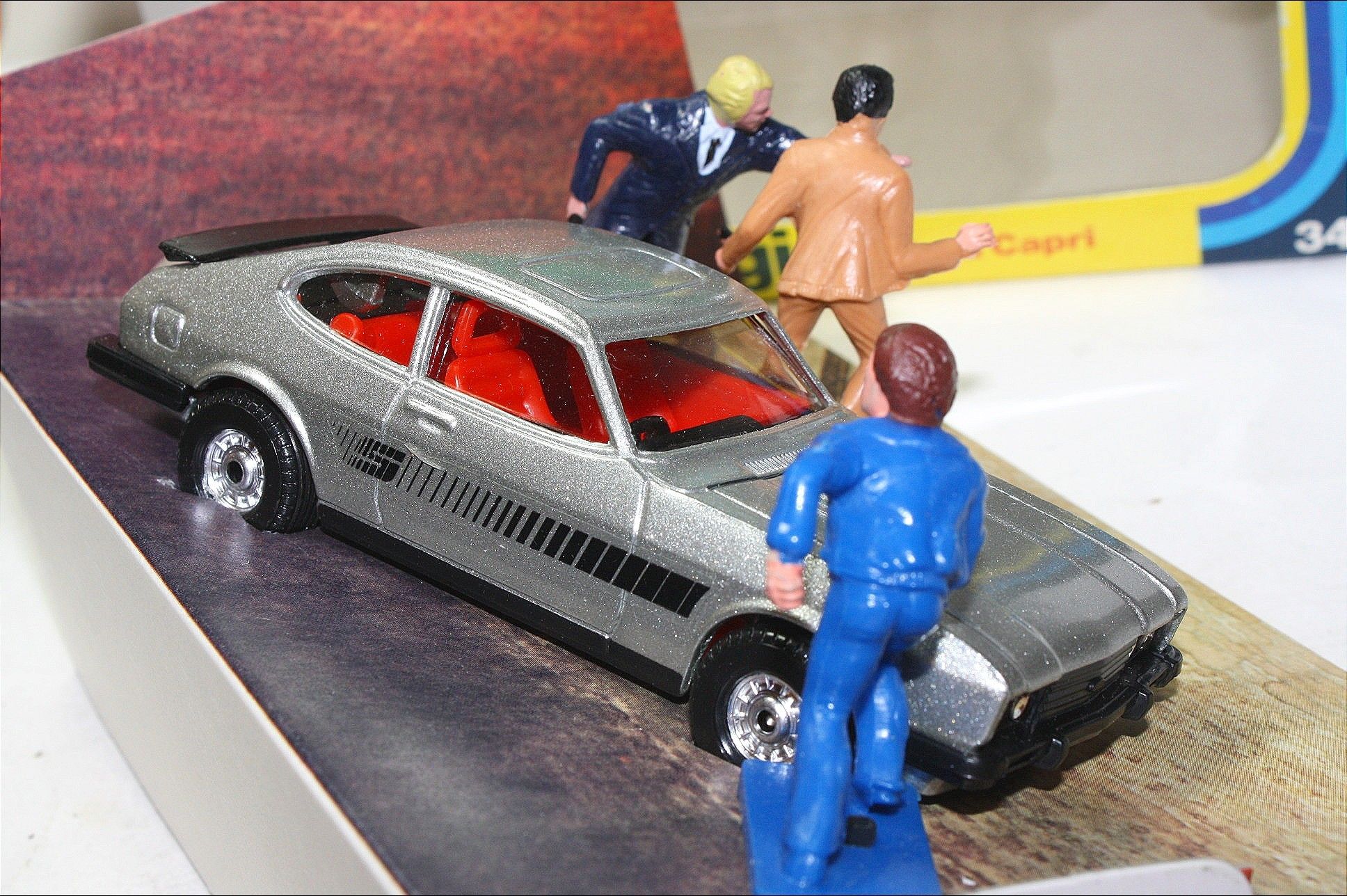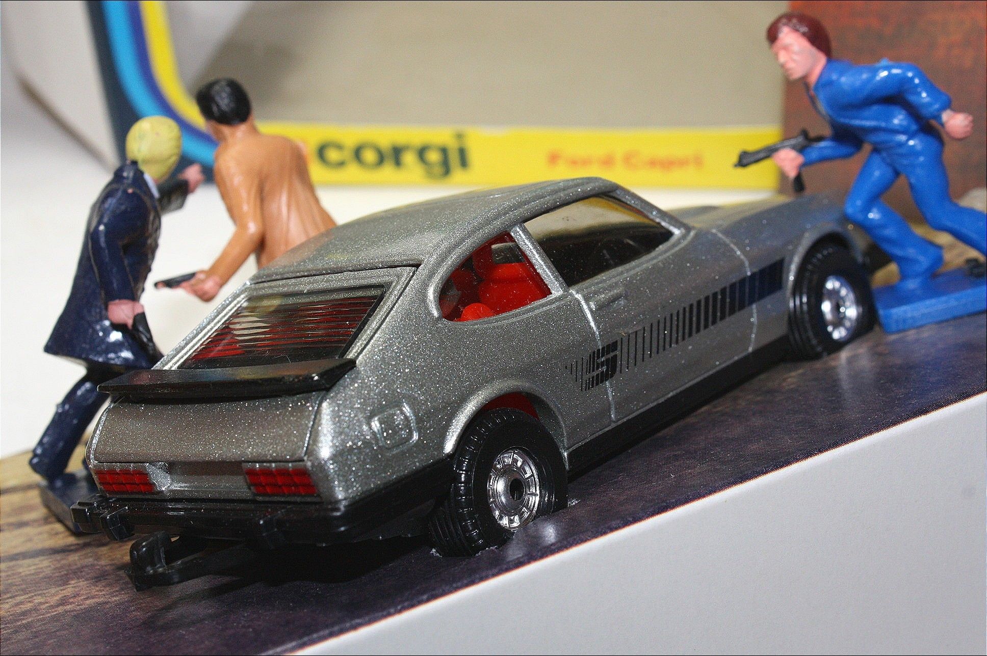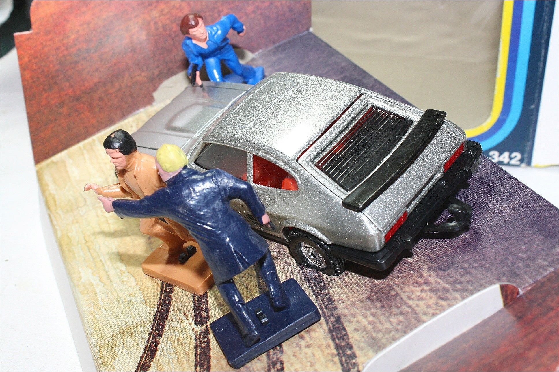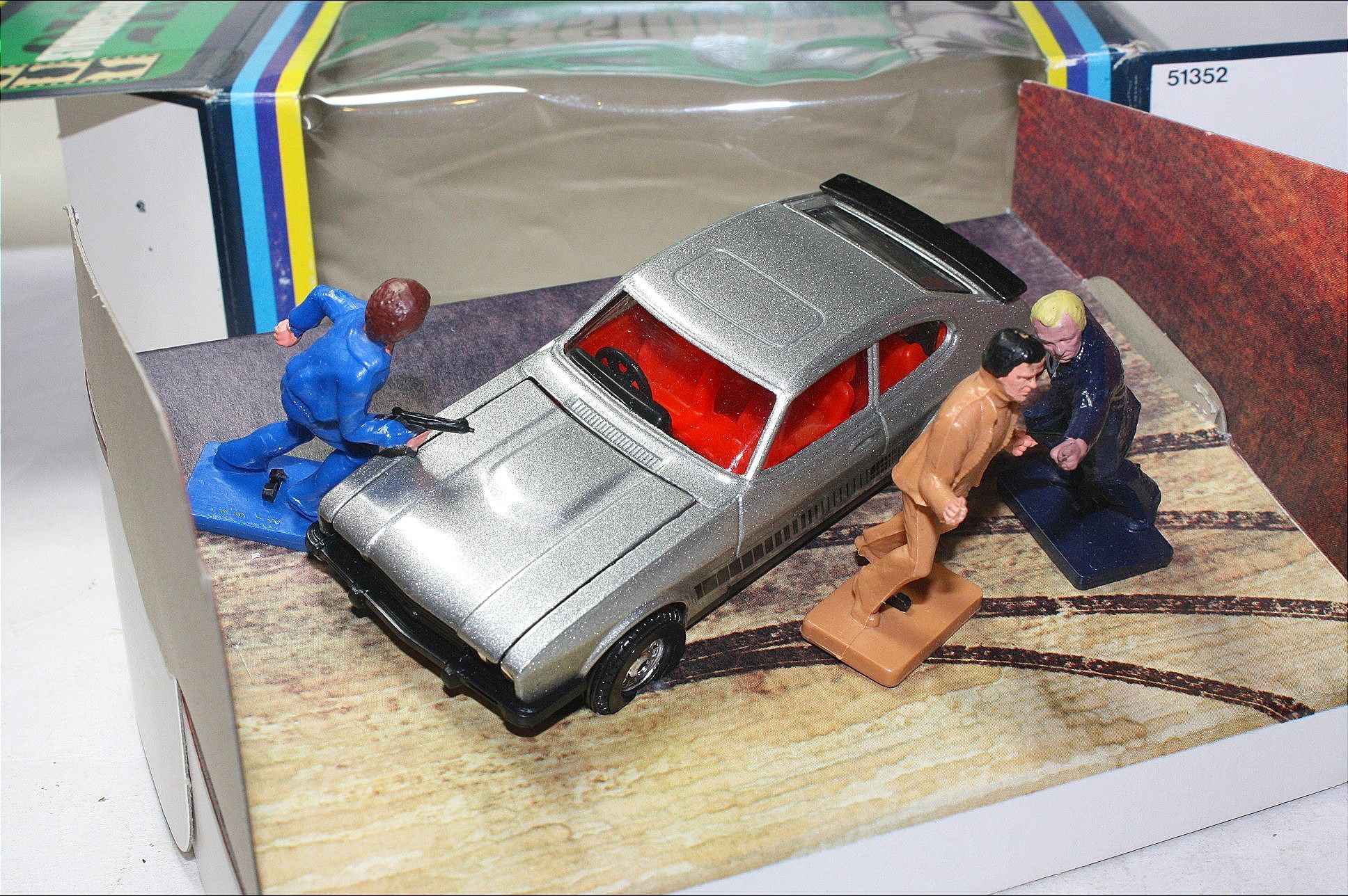 A superb example of this Corgi set from the TV series The Professionals. Gleaming original paint is mint, please study the photos for exact condition. Perfect wheels,, crystal clear windows, red interior, mint decals, all three original Bodie, Doyle and Cowley figures are mint and attached to base.