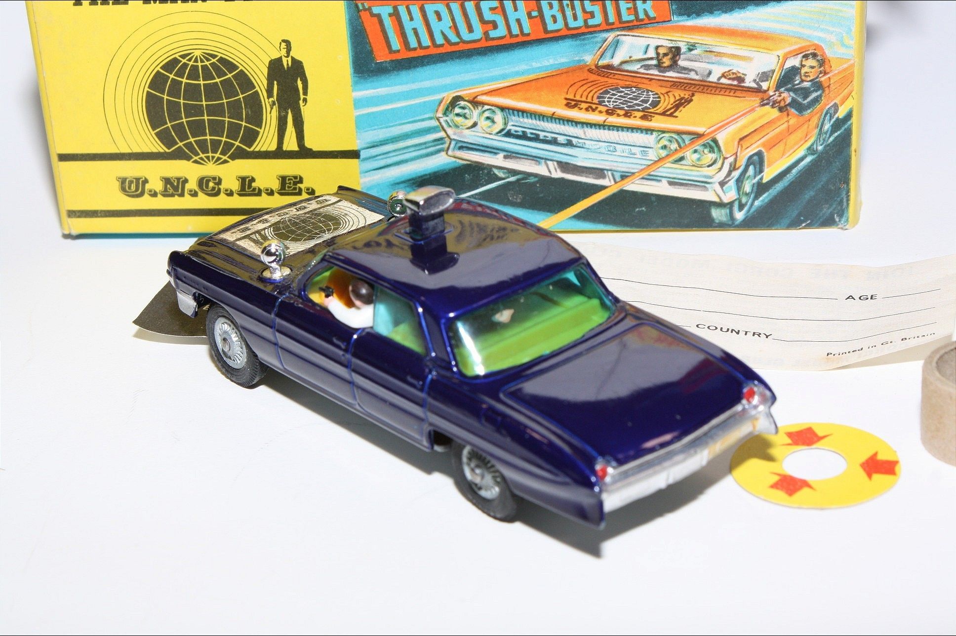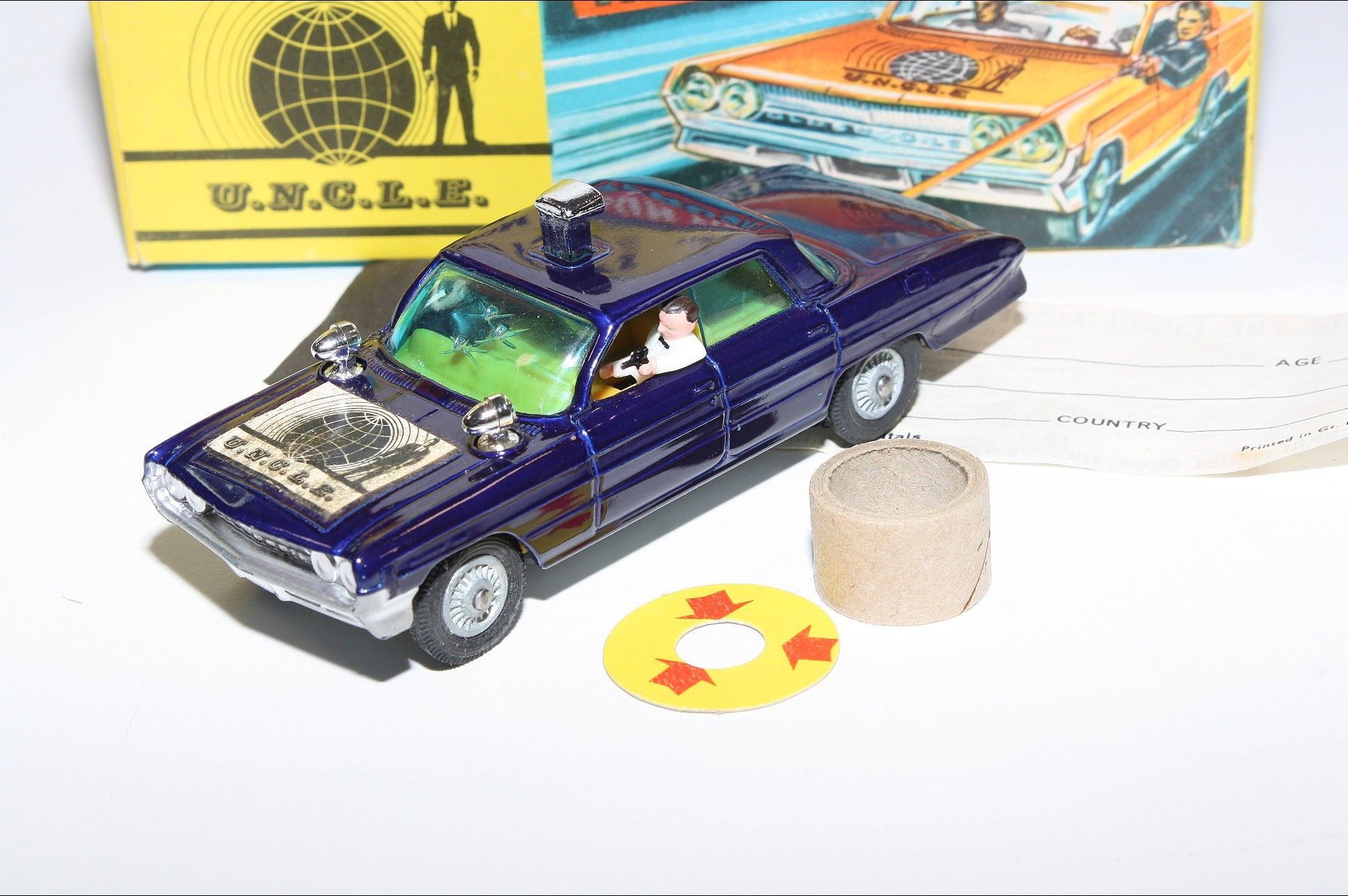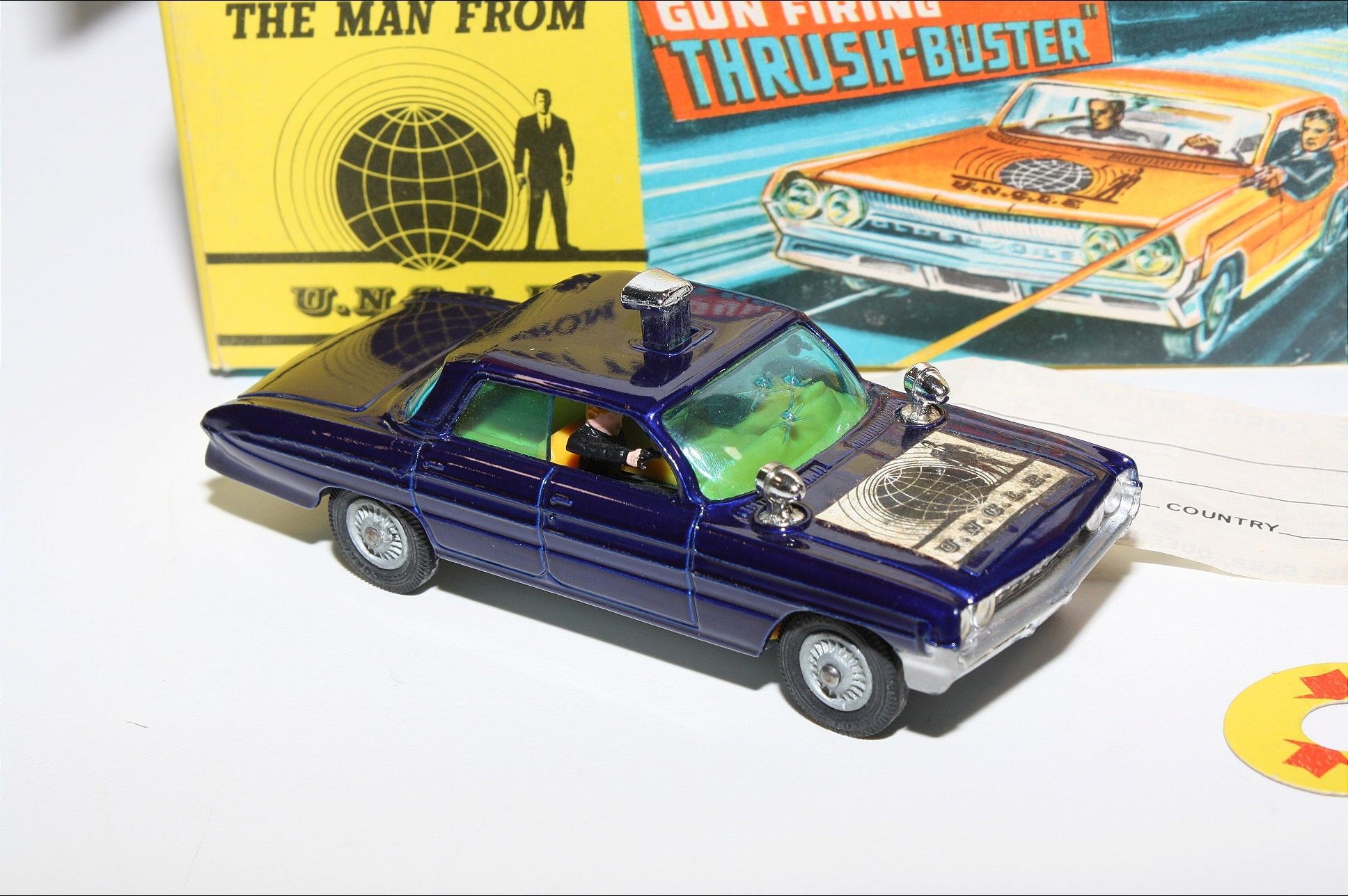 The blue Oldsmobile Super 88, made famous in MGM's 1966 series, The Man from UNCLE. Featuring Solo and Kuryakan fighting evil in New York City. Model is direct from the childhood owner. Gleaming original dark blue and silver paint in mint condition, please study the photos for exact condition. Glass (complete with bullet holes) is clear and free of any blemishes, interior good as in bonnet sticker, chrome spotlights intact, chrome finish on rooflight/button. Wheels turn freely, tyres are in good condition on cast hubs. Gun firing Thrush-Buster action works as intended with both figures perfect. slight mottling to original bonnet sticker. Appears never played with. Excellent grey base.