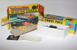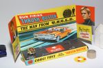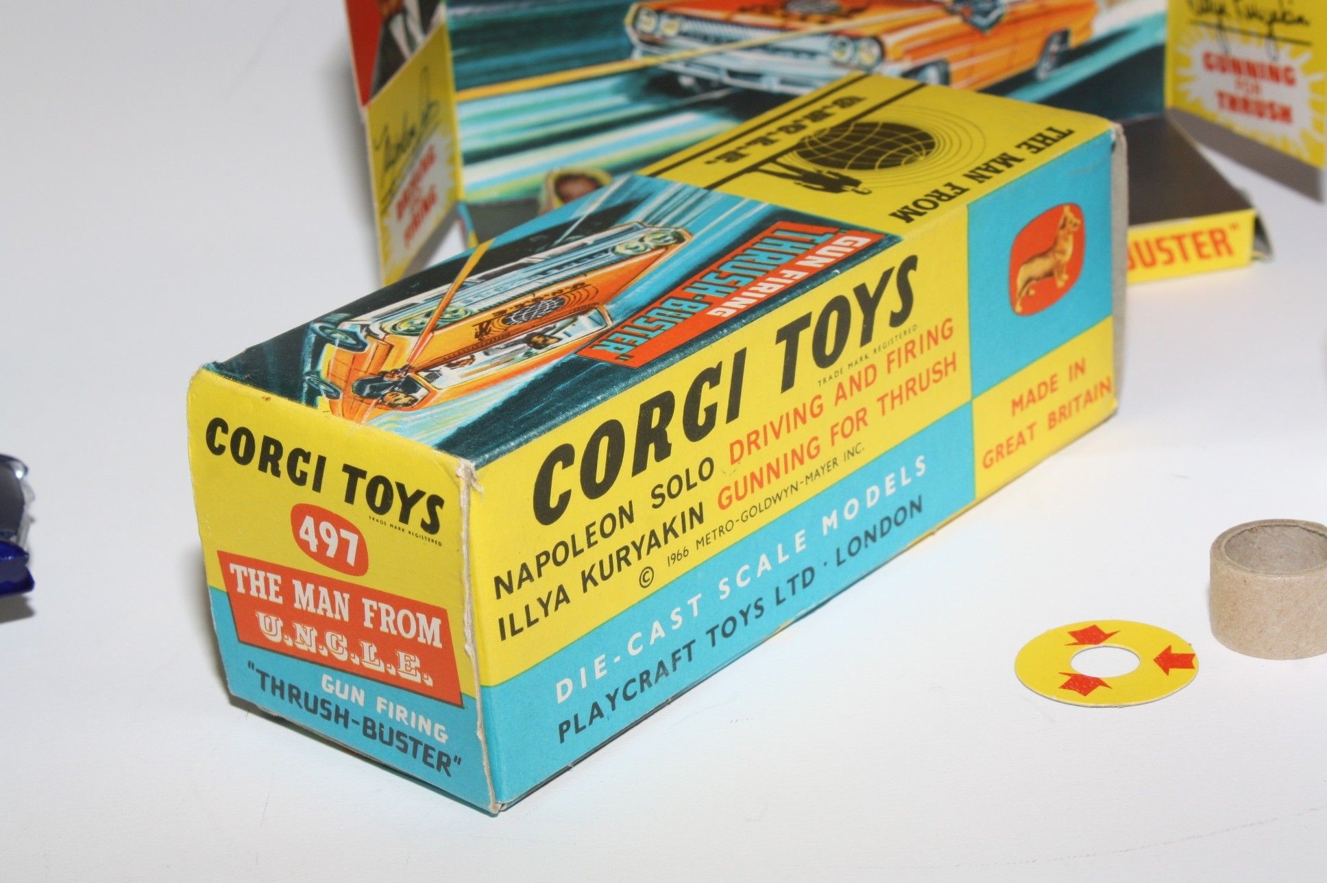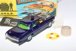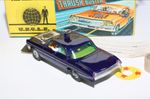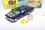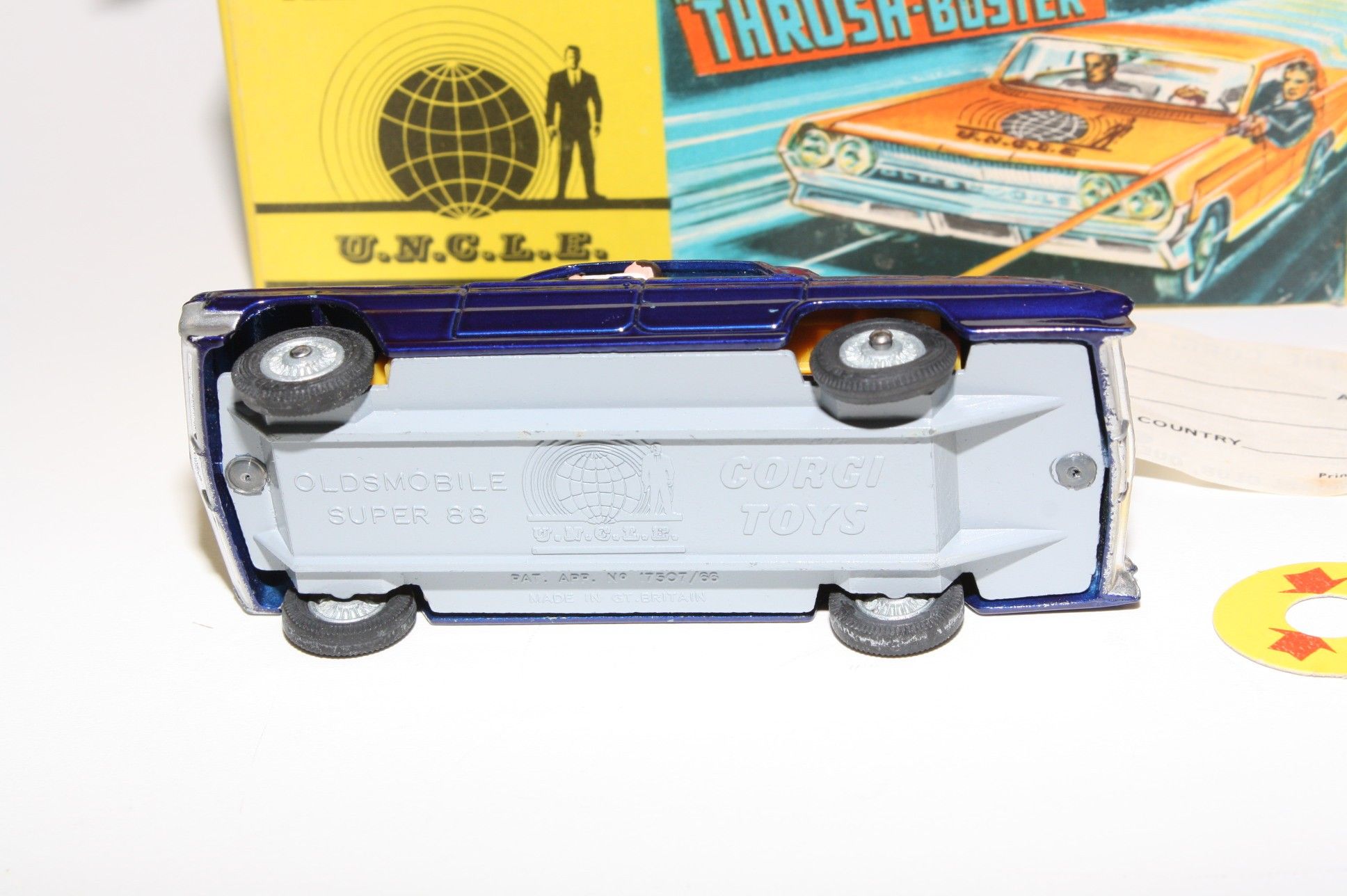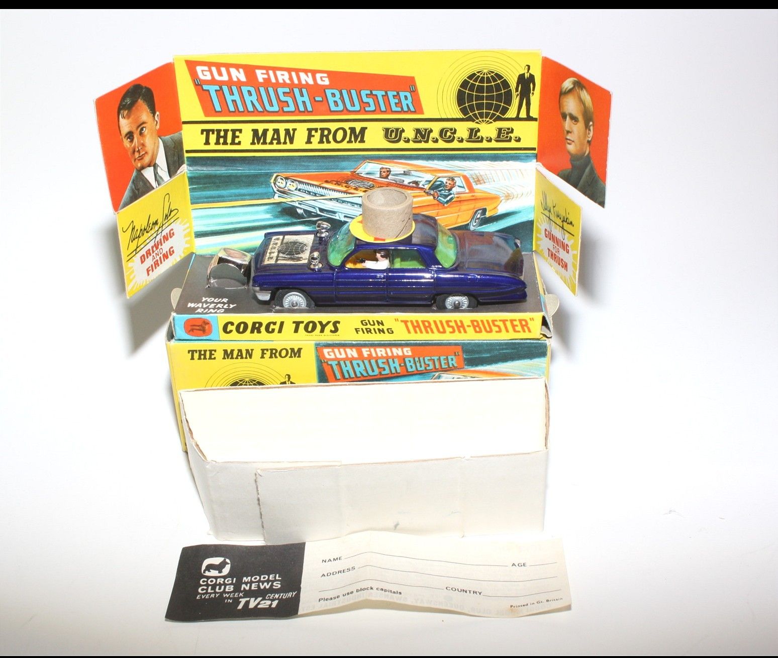 The blue Oldsmobile Super 88, made famous in MGM's 1966 series, The Man from UNCLE. Featuring Solo and Kuryakan fighting evil in New York City. Model is direct from the childhood owner. Gleaming original dark blue and silver paint in mint condition, please study the photos for exact condition. Glass (complete with bullet holes) is clear and free of any blemishes, interior good as in bonnet sticker, chrome spotlights intact, chrome finish on rooflight/button. Wheels turn freely, tyres are in good condition on cast hubs. Gun firing Thrush-Buster action works as intended with both figures perfect. slight mottling to original bonnet sticker. Appears never played with. Excellent grey base.