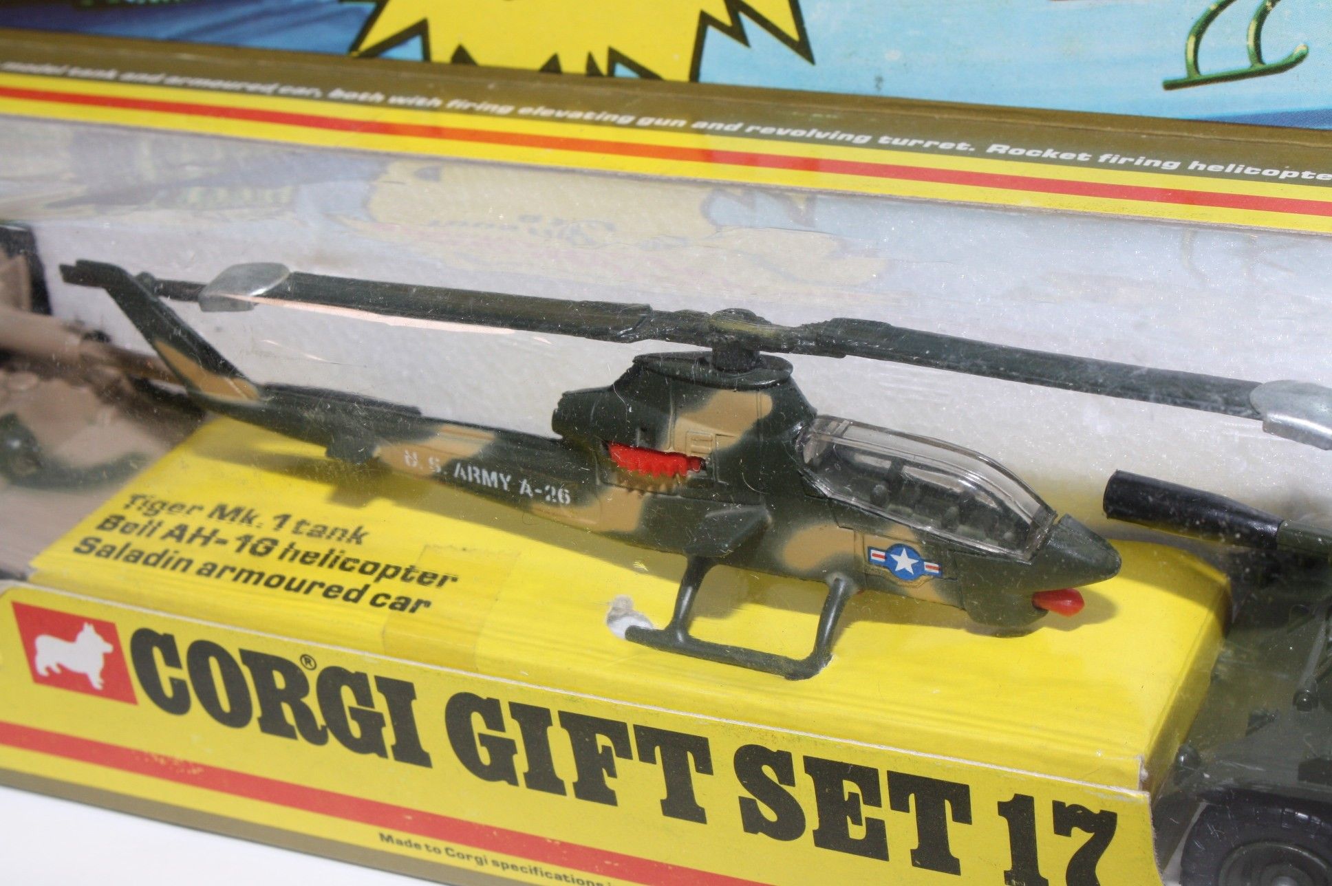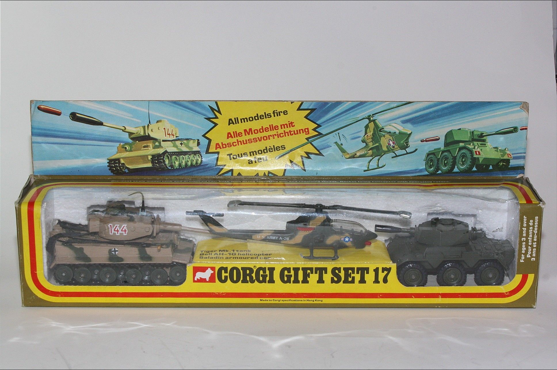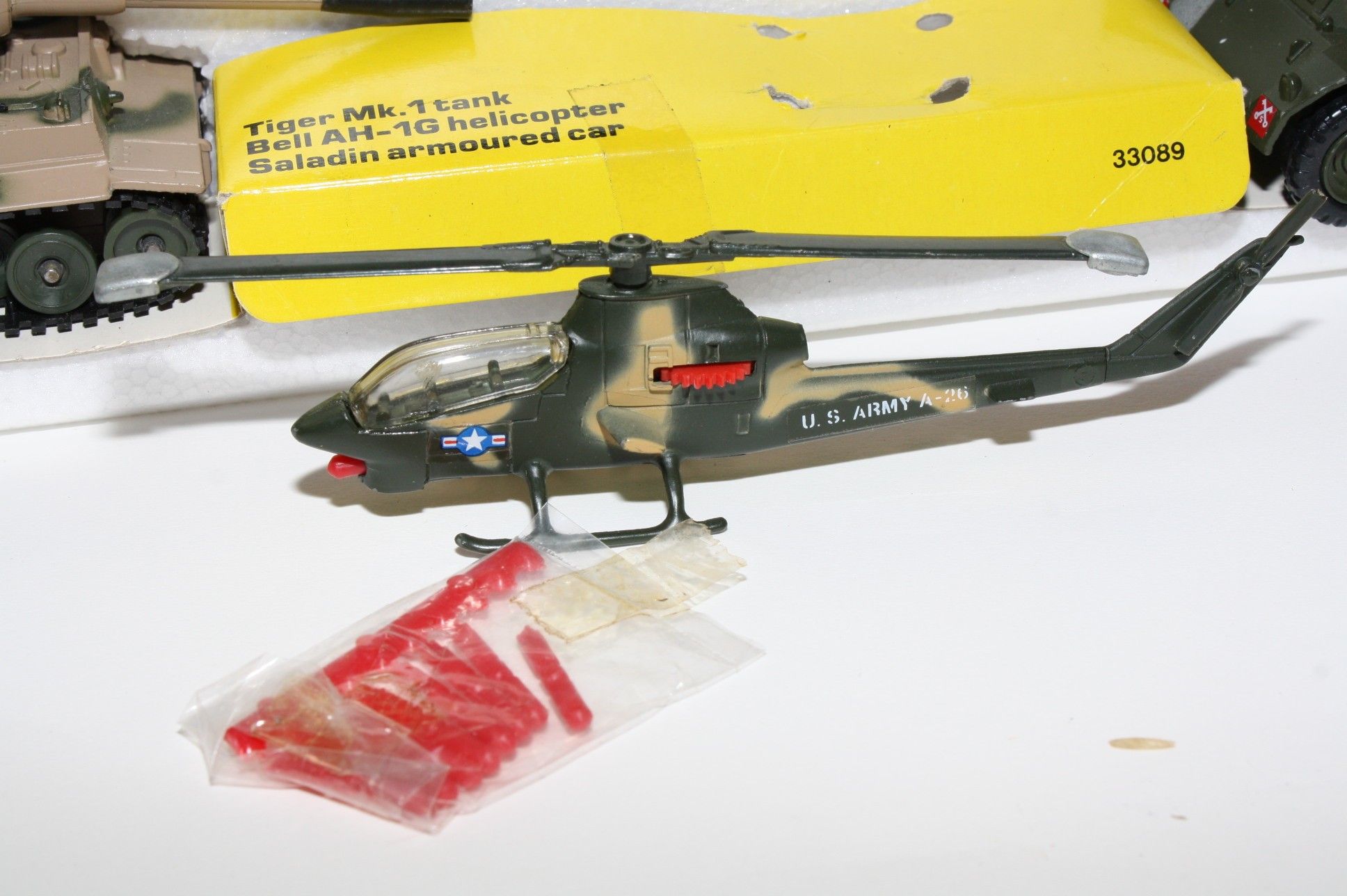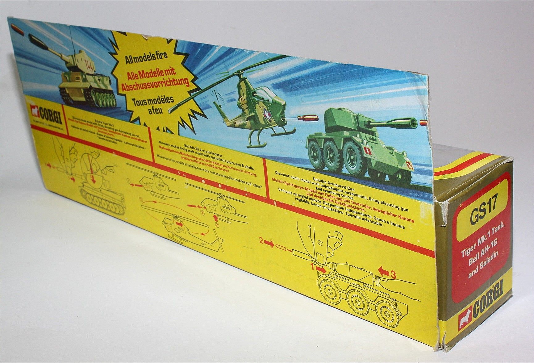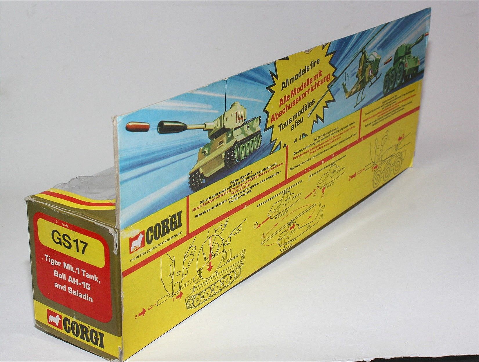 A superb example of this Corgi military set, Tiger Mk 1 Tank, Bell AH-1G Helicopter and a Saladin. Original paintwork is mint on all three models which have not been used, please study the photos for exact condition . All tyres on tanks are perfect, good decals, all fire missiles which are present with sprue . All mint underside