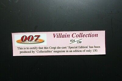 A rare opportunity to acquire a Corgi James Bond 007 Villain Collection Collector Magazine exclusive limited edition set. This is number 24 out of an edition of 150. As there were only 150 sets available worldwide.This James Bond Villain Collection set is very rare and hard to find with complete sets rarely becoming available.This set is in mint condition and is still in its original packaging and was exclusively made for Collector Magazine and are hand numbered. Please study the photos for exact condition. A fabulous addition to any Bond Collection