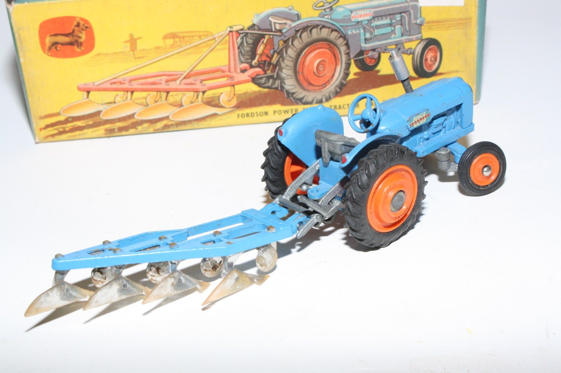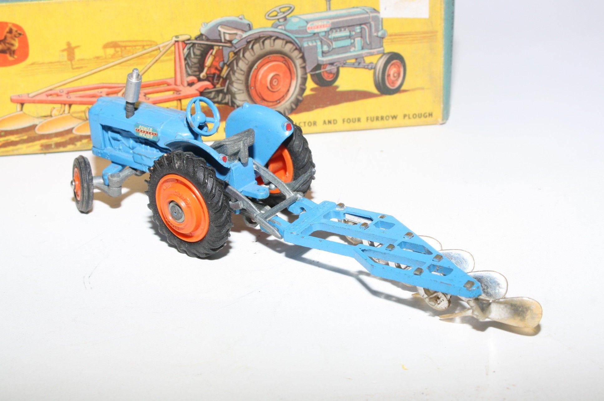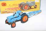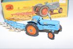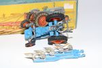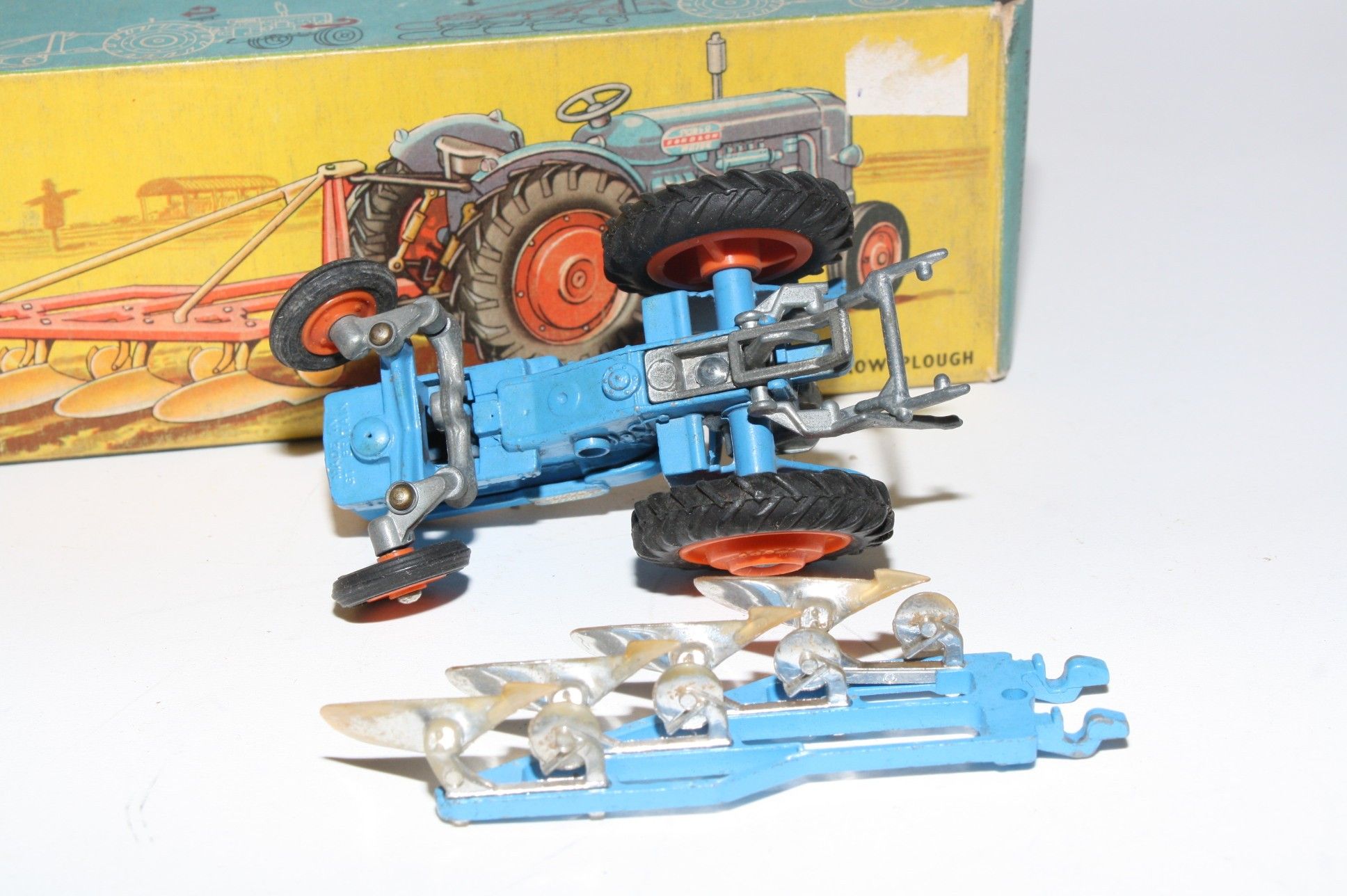 A nice original example of this scarce early 1960's model set. All original paintwork is very good with some chips, please study the photos for exact condition. Original tyres on orange plastic hubs, steering feature ok, original seat, steering wheel, sprung exhaust and decals present. Plough complete but with some chrome loss to blades. Good undersides.