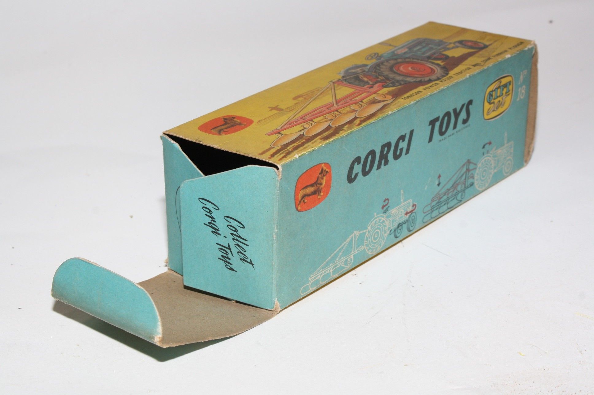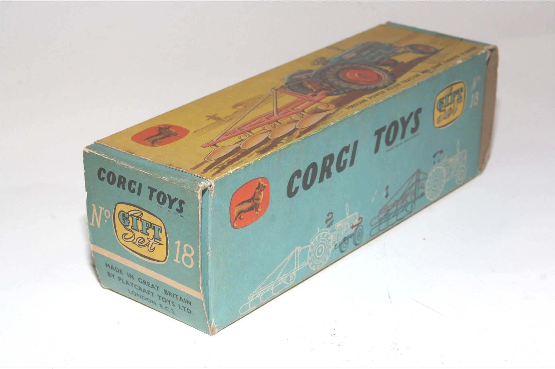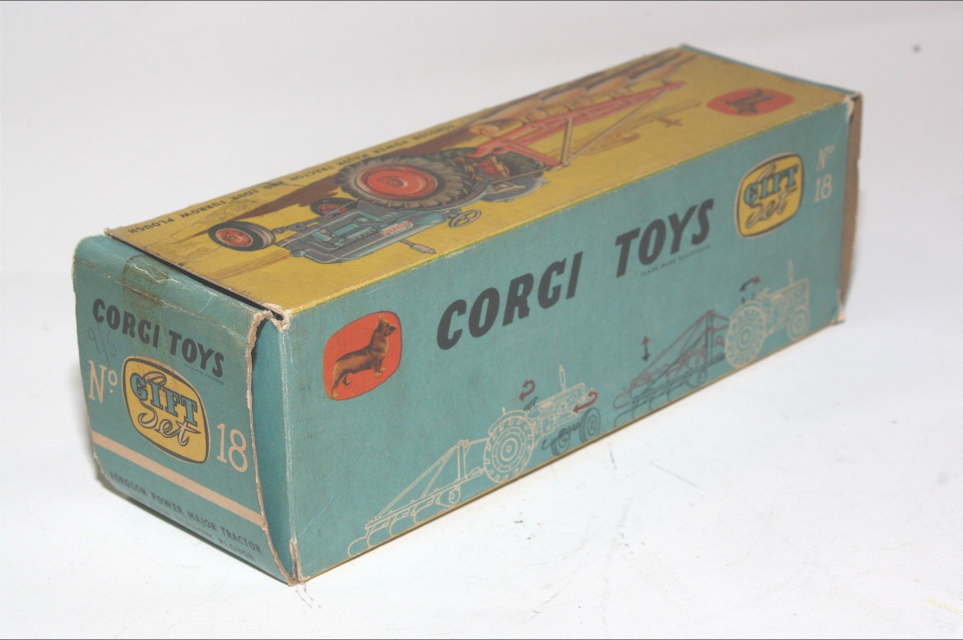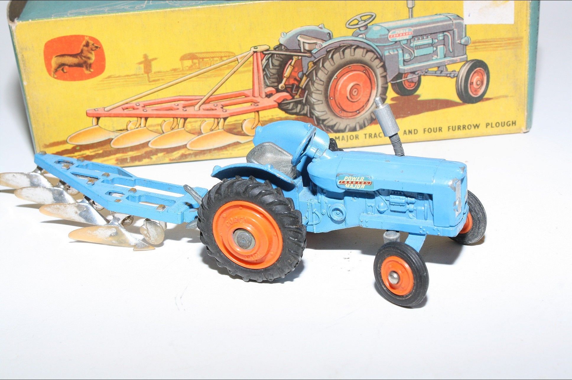 A nice original example of this scarce early 1960's model set. All original paintwork is very good with some chips, please study the photos for exact condition. Original tyres on orange plastic hubs, steering feature ok, original seat, steering wheel, sprung exhaust and decals present. Plough complete but with some chrome loss to blades. Good undersides.
