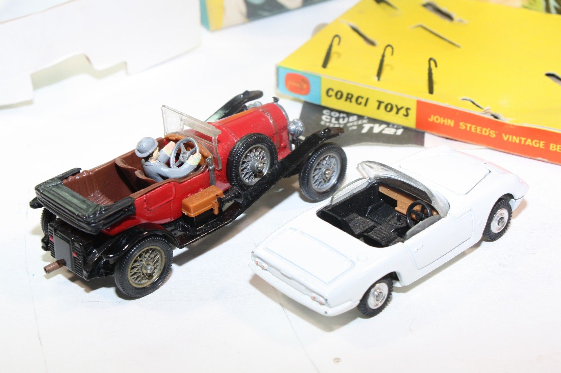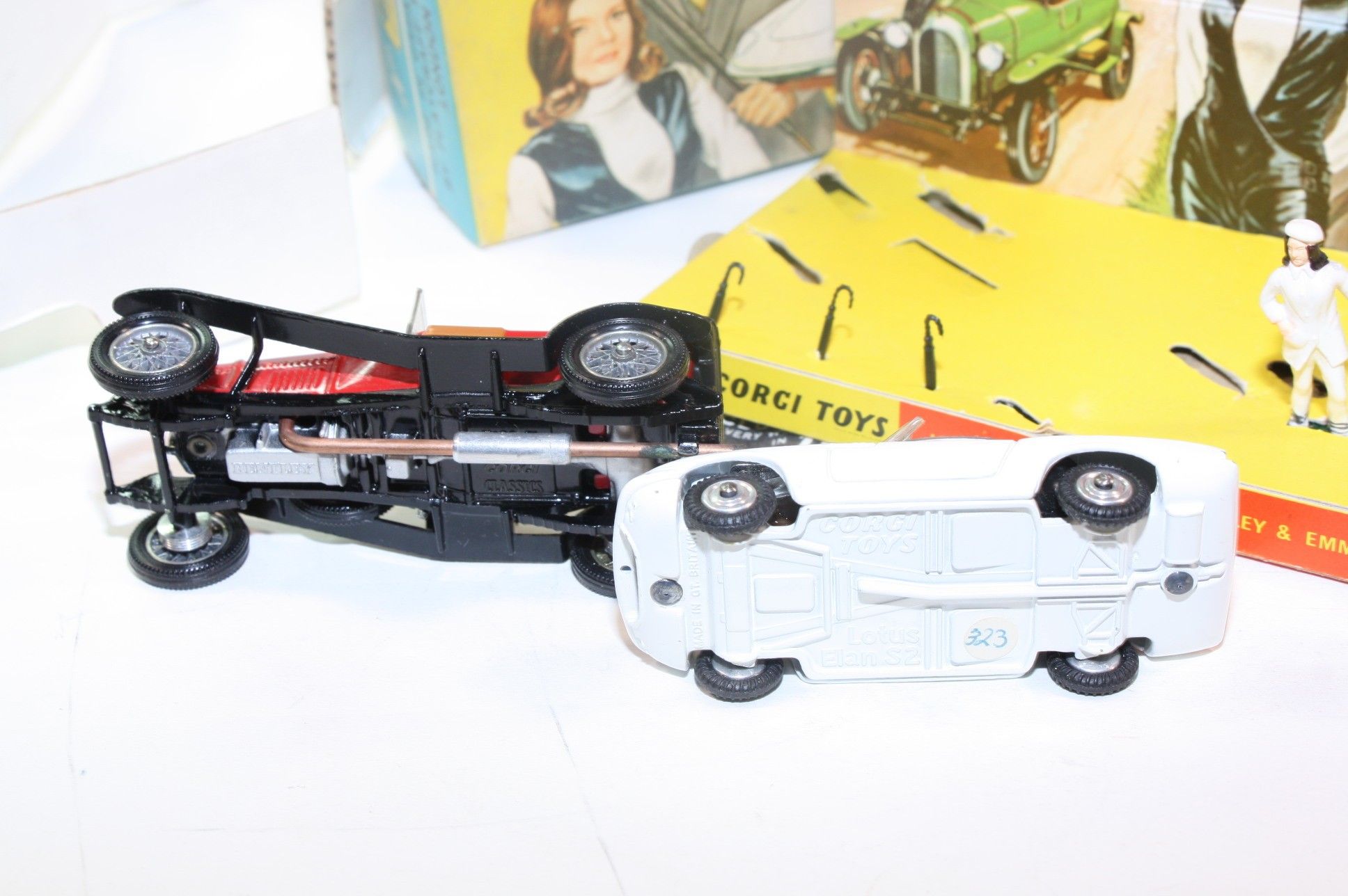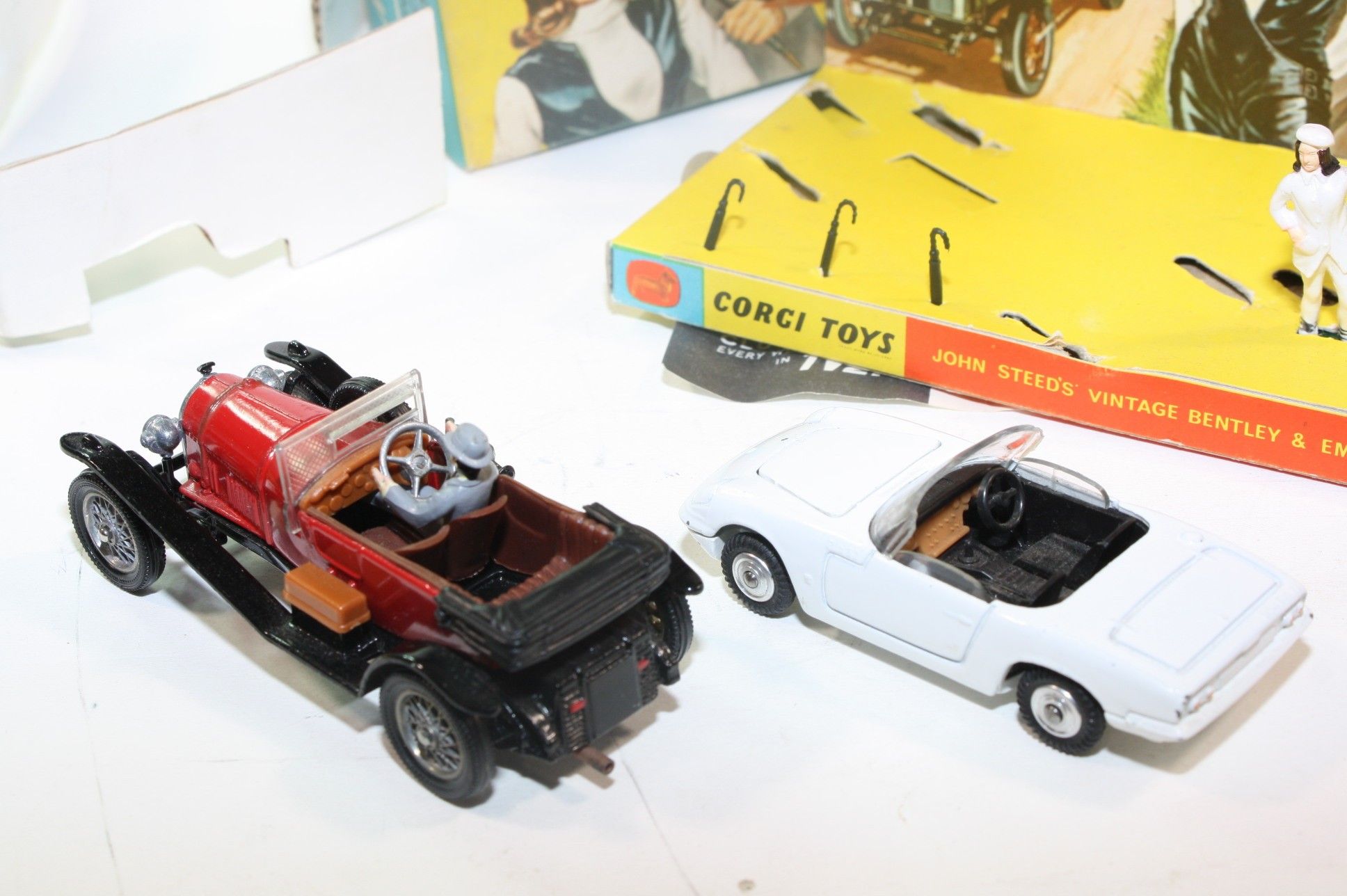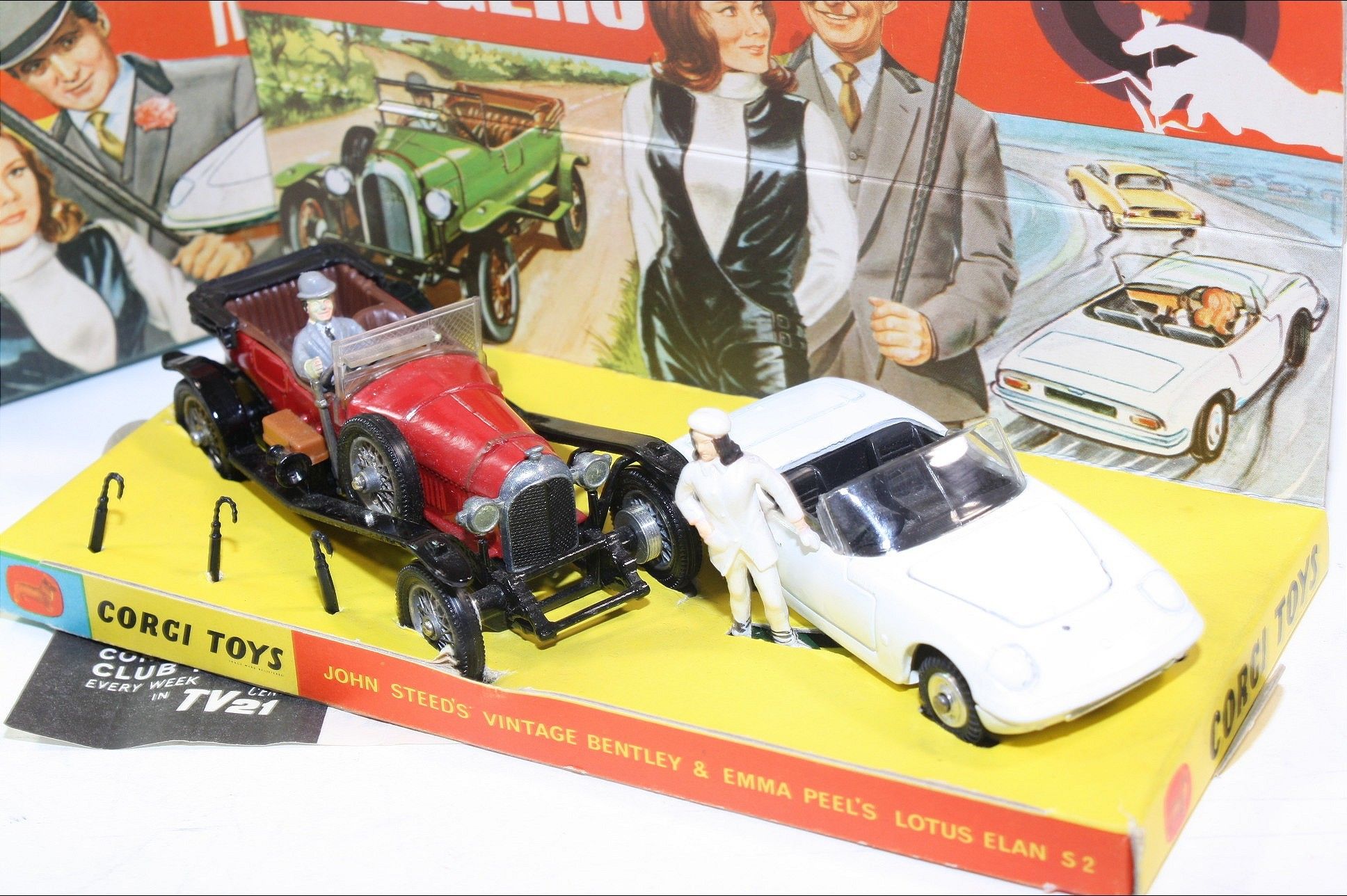 A lovely example of this early issue Corgi model set from the 1960's TV series The Avengers. Excellent paintwork on both models, mint on Bentley and small chip to front of Elan, please study the photos for exact condition. All original tyres on spoked and spun hubs, suspension great on Emma Peels Lotus, good windscreen and windows, original figures and perfect interiors, 1 original and 2 replacement umbrellas, baseplates excellent.