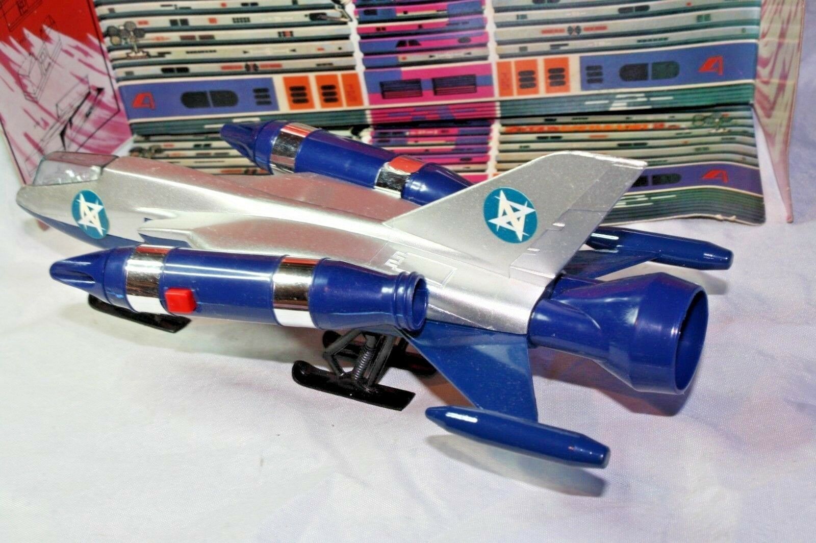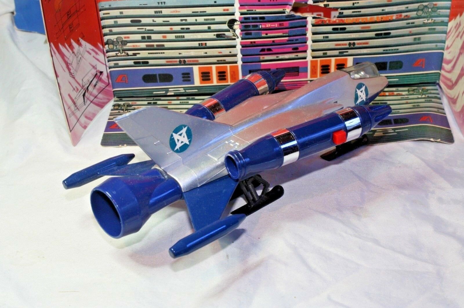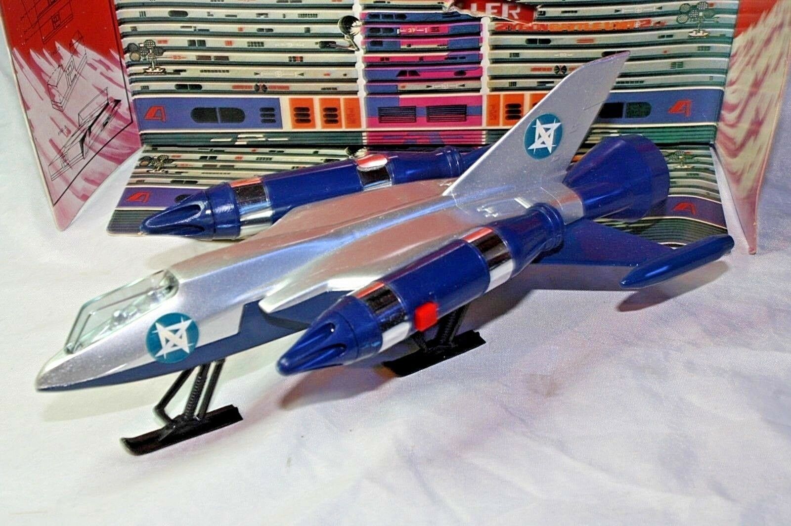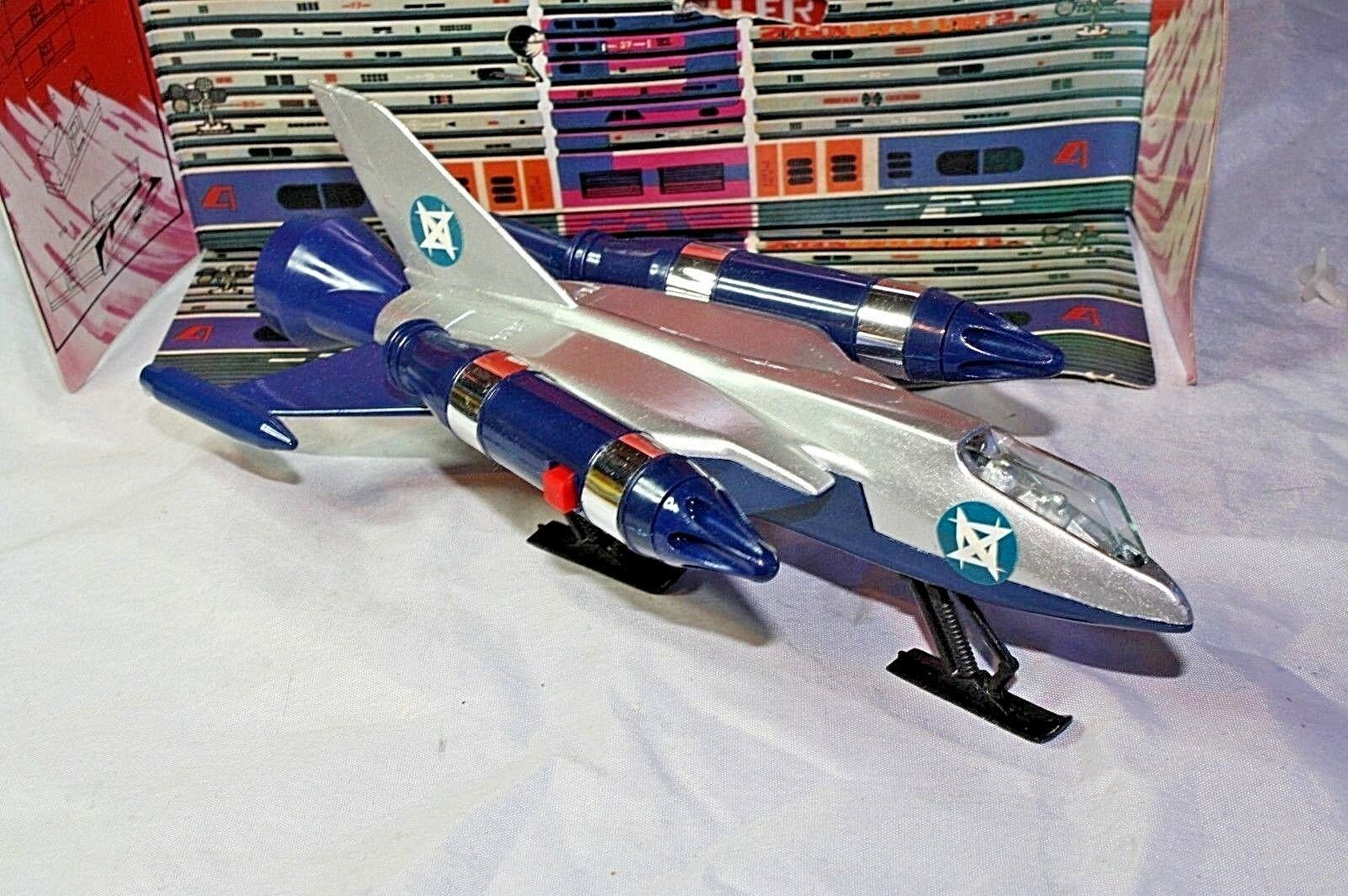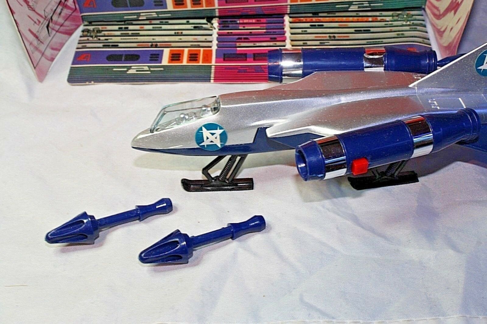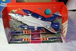 A mint example of this late 1970's space fighter. Blue and silver bodywork in mint condition, please study the photos. All ski style undercarriage perfect, cockpit and 2 pilots present, stickers fine, 2 spring loaded missiles all function powerfully as they should. Model comes with cut out space station.