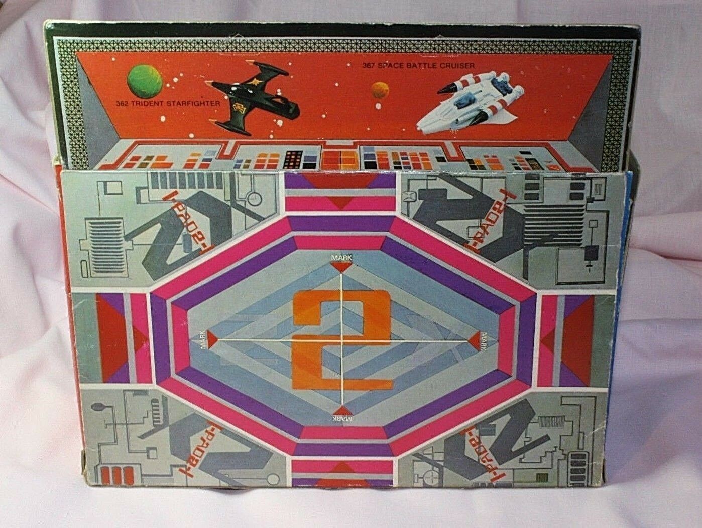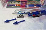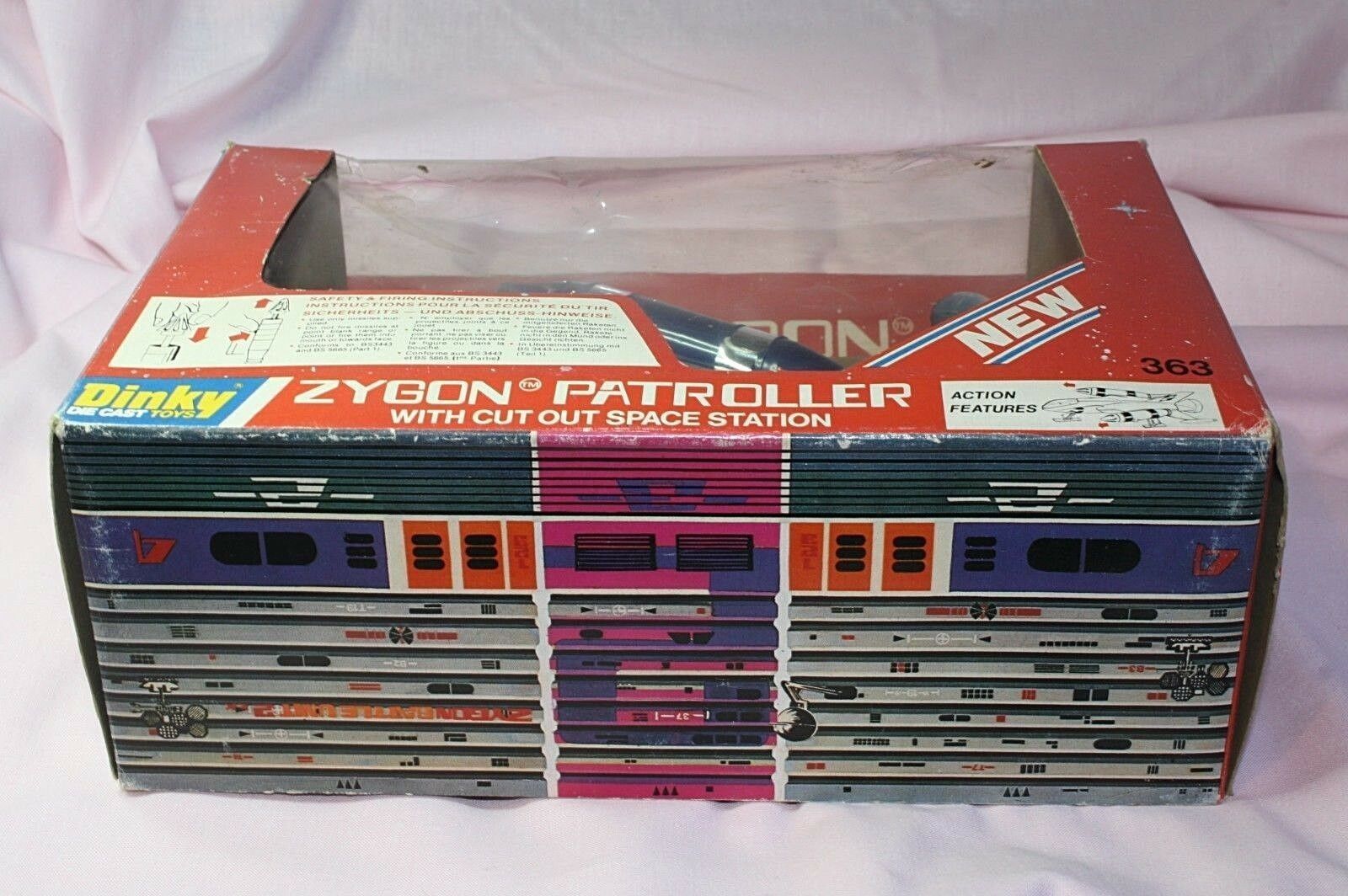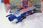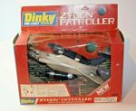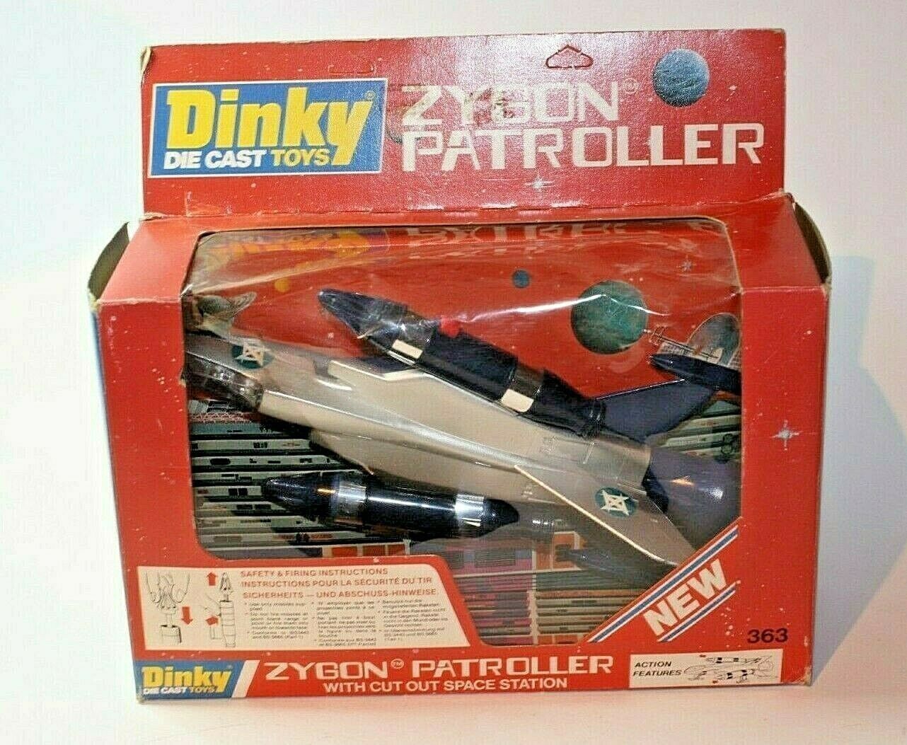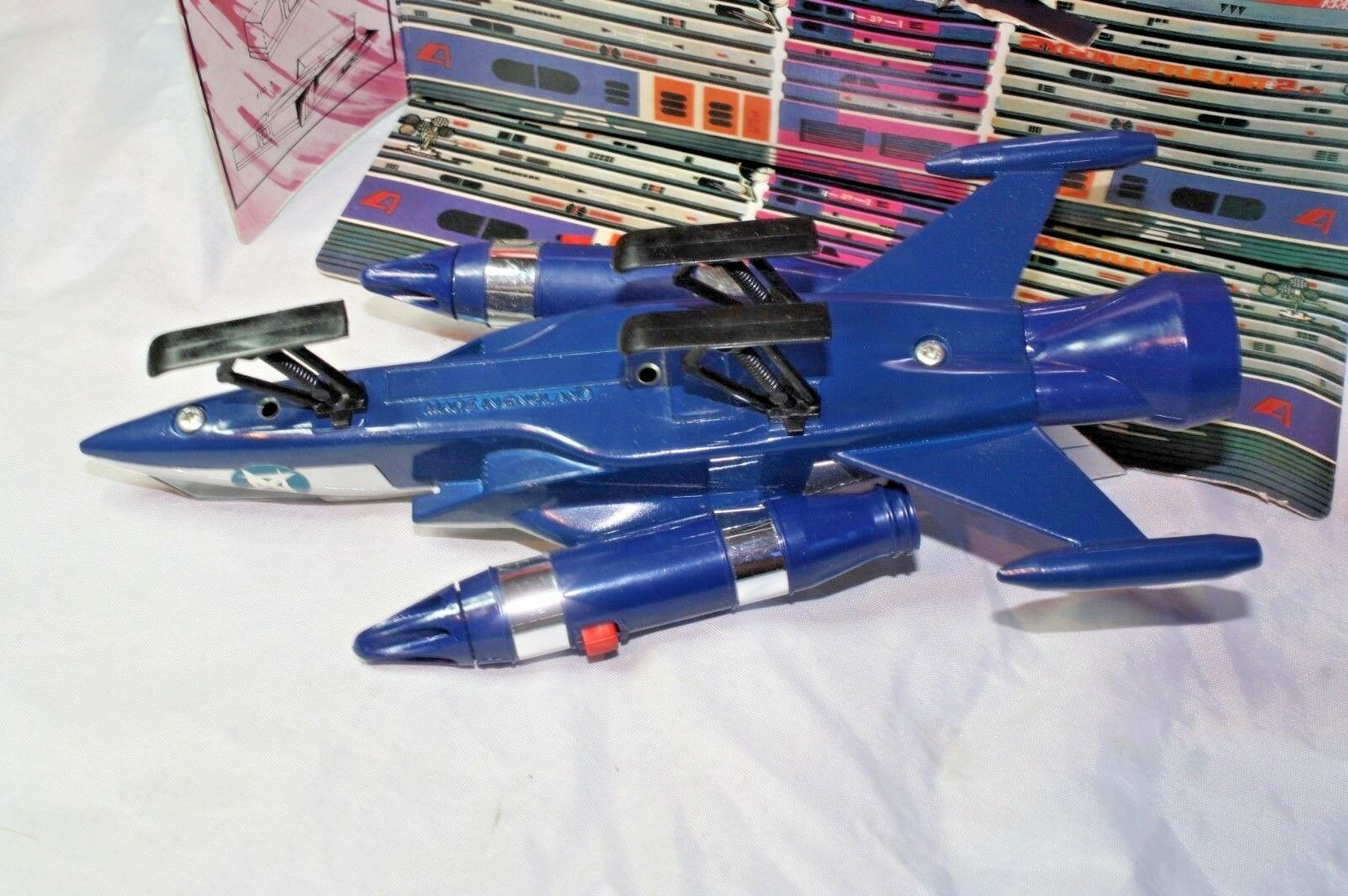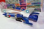 A mint example of this late 1970's space fighter. Blue and silver bodywork in mint condition, please study the photos. All ski style undercarriage perfect, cockpit and 2 pilots present, stickers fine, 2 spring loaded missiles all function powerfully as they should. Model comes with cut out space station.