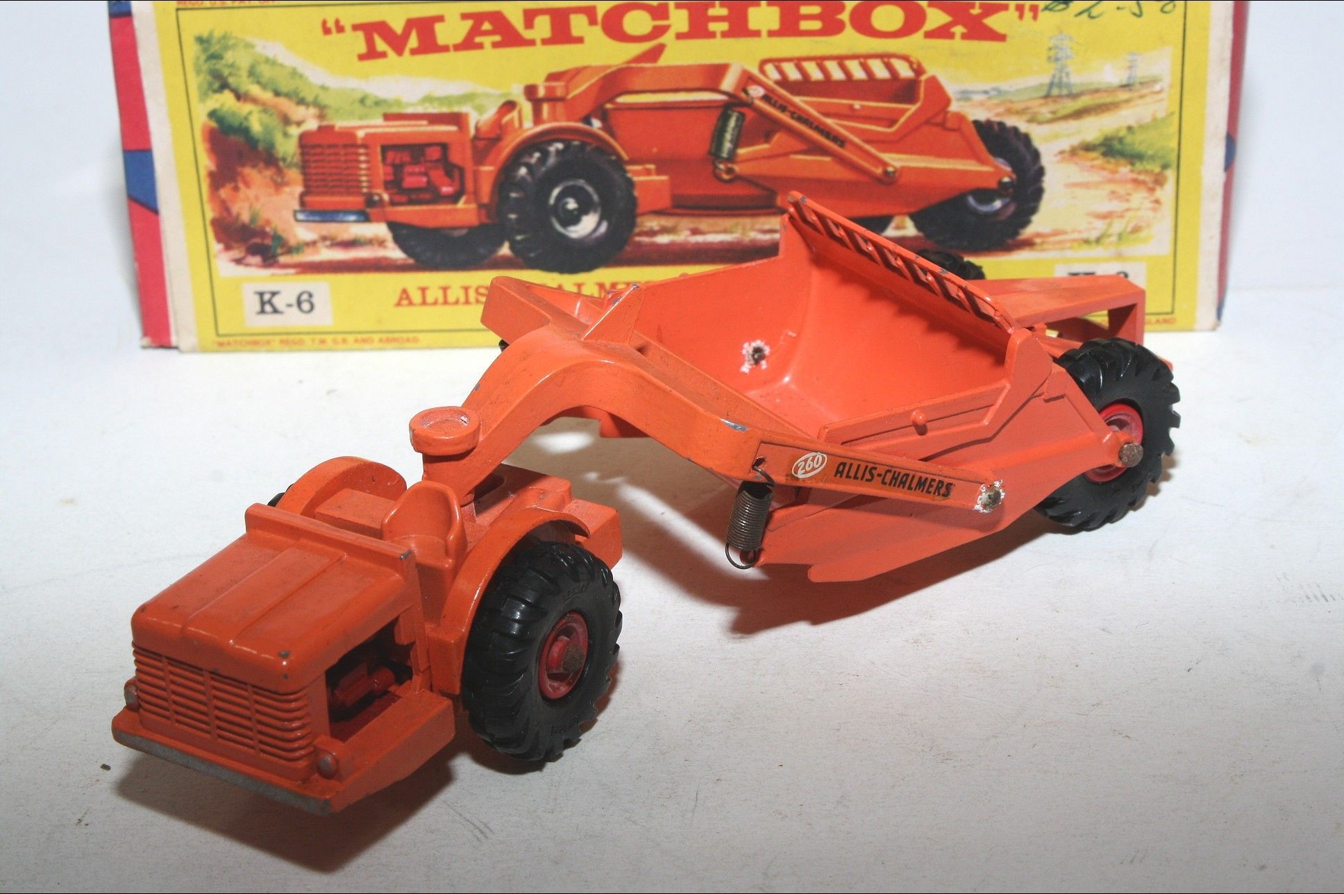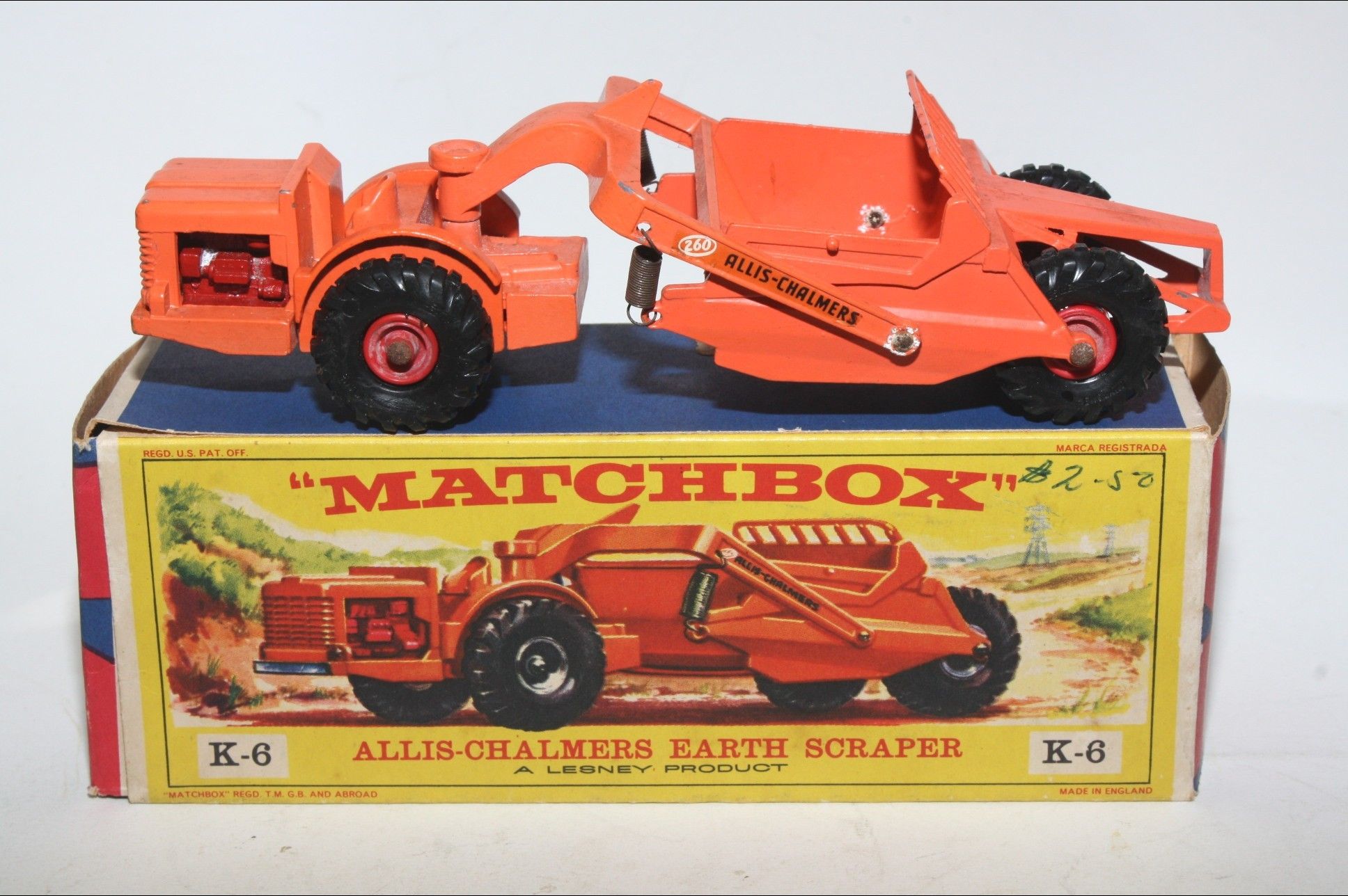 A good example of this mid 1960's King Size model. Original blue green paintwork is good, a few nicks and rubs and slightly dull, please study the photos for exact condition. Original plastic tyres, cast hubs, good decals, sprung scrapper all good, Underside good.